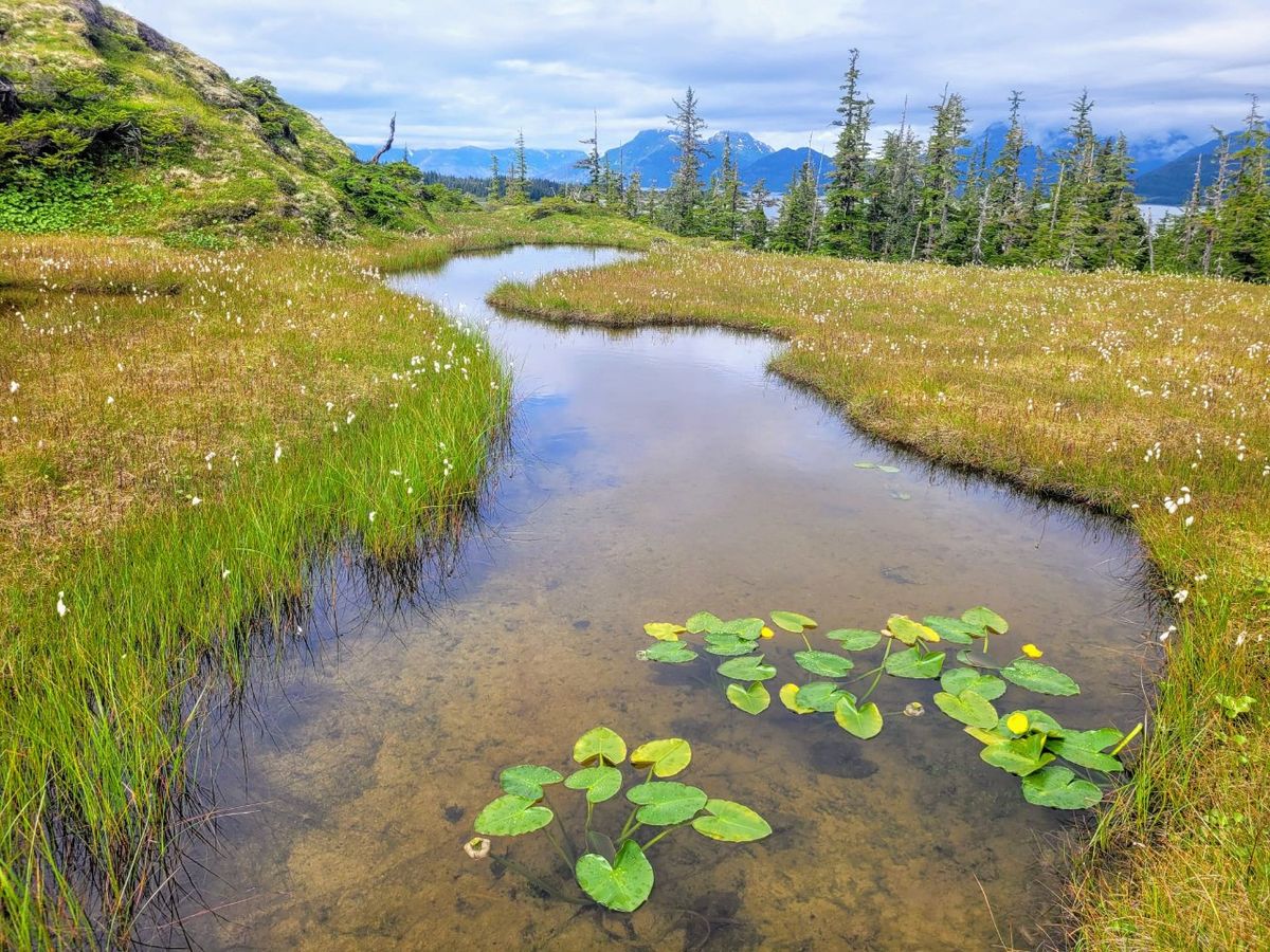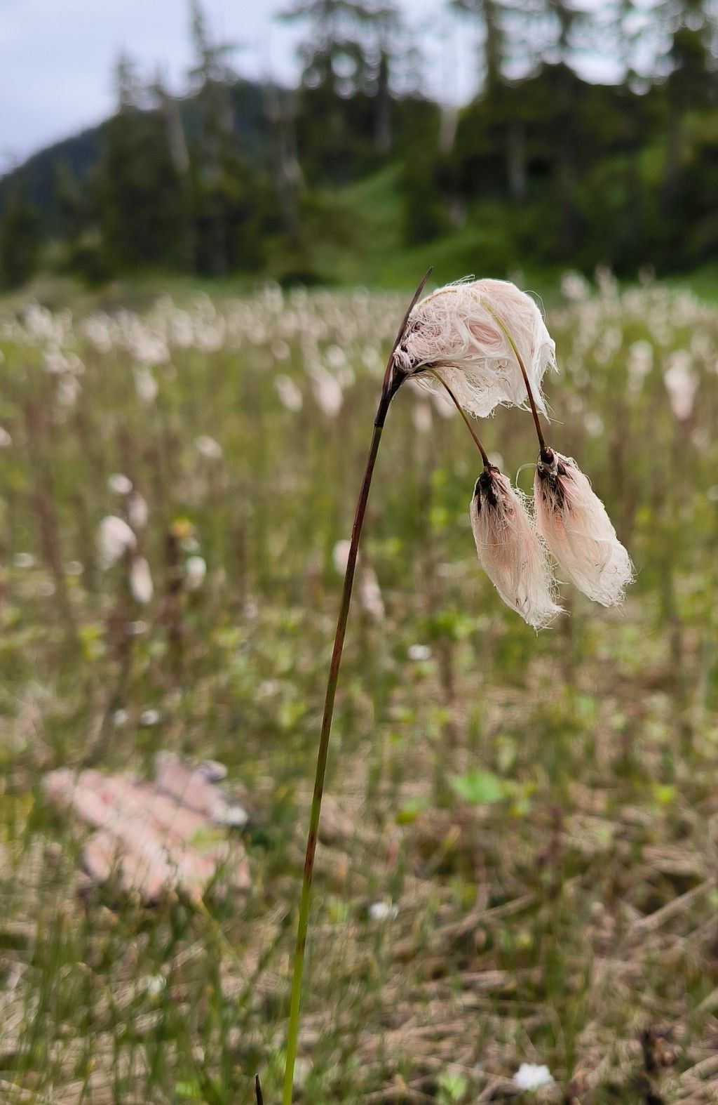 Die Landschaft ist grün in allen Abstufungen. Es wachsen kleine Blumen und ganze Felder mit Wollgras. Vom höchsten Punkt aus kann man draußen im Fjord ein paar Eisberge treiben sehen.