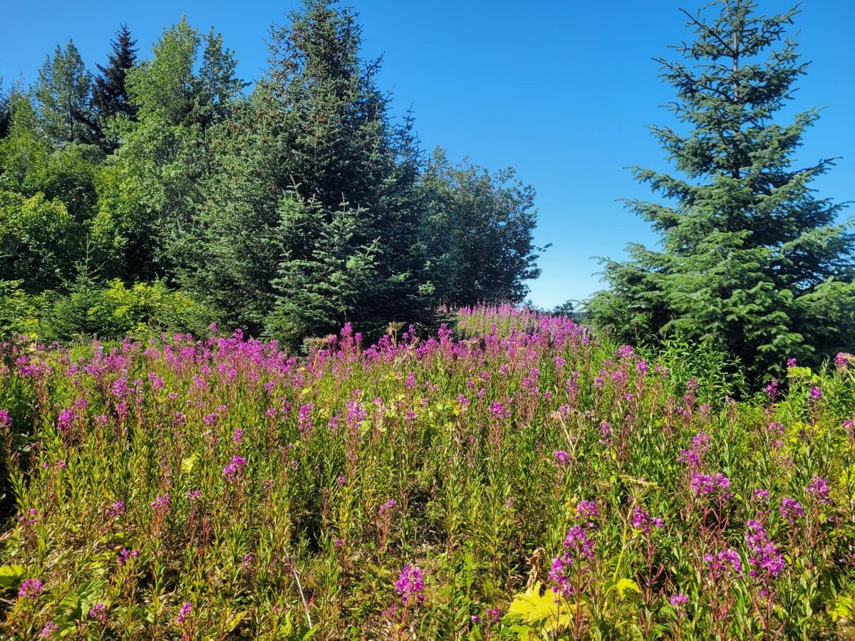 Ganze Bäume, komplett mit Wurzelballen, liegen am Ufer. Die Salmonberries sind reif. Diese roten Früchte werden auf deutsch mit Pracht-Himbeere oder auch Lachsbeere übersetzt. Der Geschmack kommt einer Mischung aus Brombeeren und Himbeeren nahe. Bei den Tieren sind sie sehr beliebt. Nicht nur Vögel und Nager, sondern auch die großen Bären naschen gerne Salmonberries.