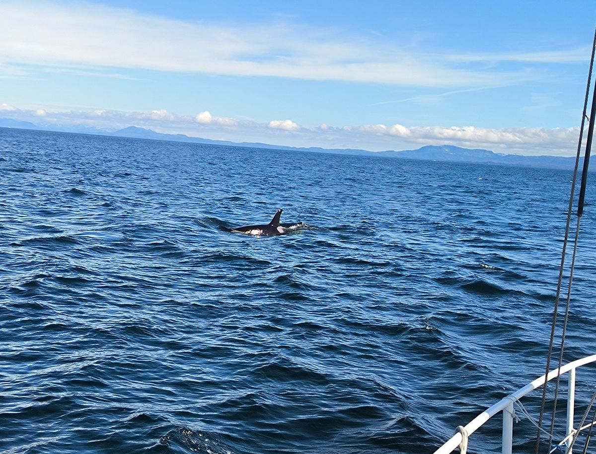 Mittags gibt es eine kurze Begegnung mit Delfinen, aber die haben es eilig und ziehen schnell vorbei. Am Nachmittag erleben wir dann großes Kino mit einem Dutzend Orcas. Zunächst sind es nur 3 Exemplare weit voraus, aber die kommen näher, und es werden immer mehr. Von allen Seiten kommen Orcas auf die Walkabout zu und bieten eine grandiose Vorstellung ganz nahe beim Boot. Wir zählen mindestens 10 Stück. Einer schwimmt direkt neben unserem Bug und taucht dann unter unserem Rumpf ab. Das war’s. Wie abgesprochen sind sie plötzlich alle verschwunden und tauchen nicht mehr auf. Wie gut, dass hier keine bösen Vorfälle bekannt sind. In der Gegend um Gibraltar herum wäre eine solche Anzahl sicherlich beängstigend. Ein befreundeter Segler hat uns letzte Woche erst berichtet, dass nur 2 Seemeilen entfernt von ihm ein Segelboot von Orcas angegriffen wurde und gesunken ist.
