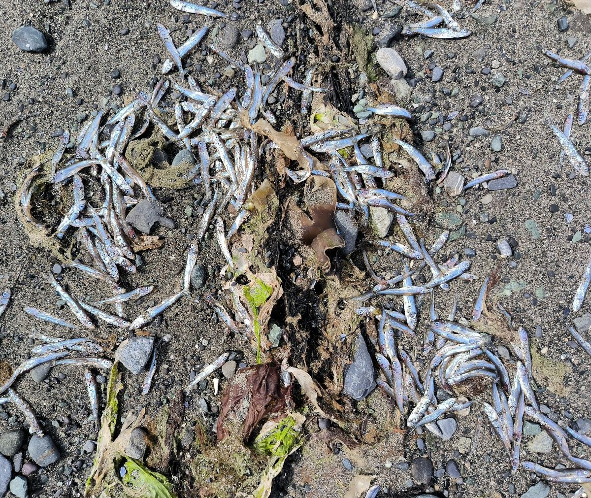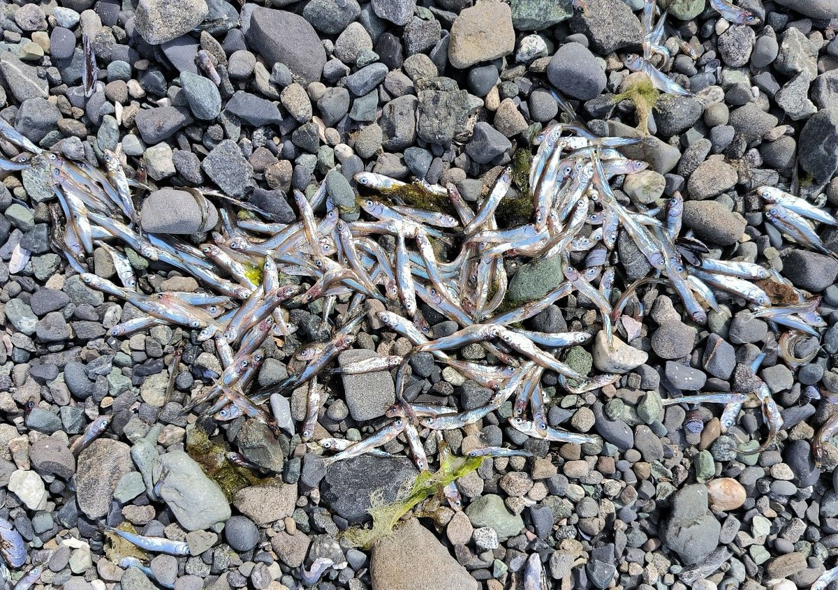Es ist ablaufendes Wasser. Am Flutsaum glitzern winzige Fischchen, die hier gestrandet sind. Wir wundern uns über die Menge, es müssen Tausende sein. Sie sehen aus wie kleine Öl-Sardinen und riechen aus so.