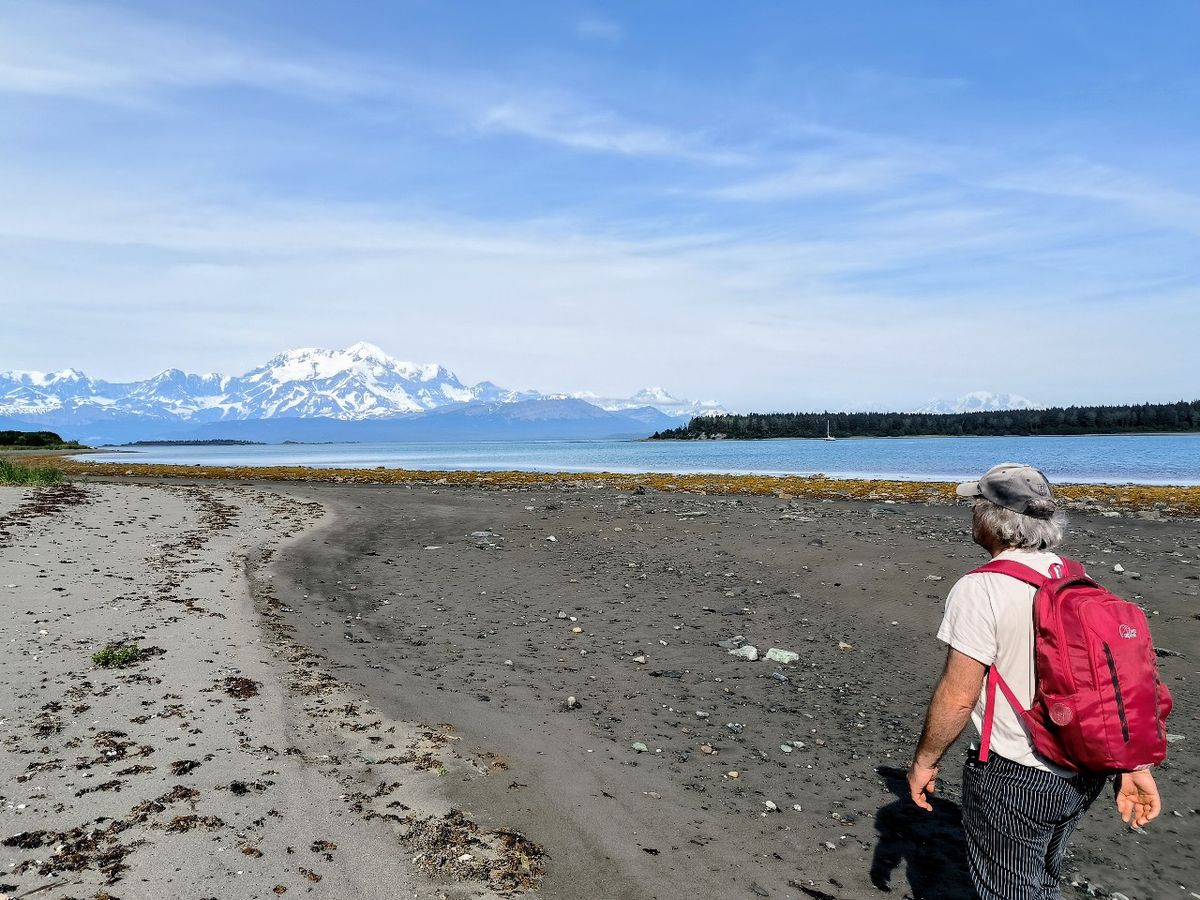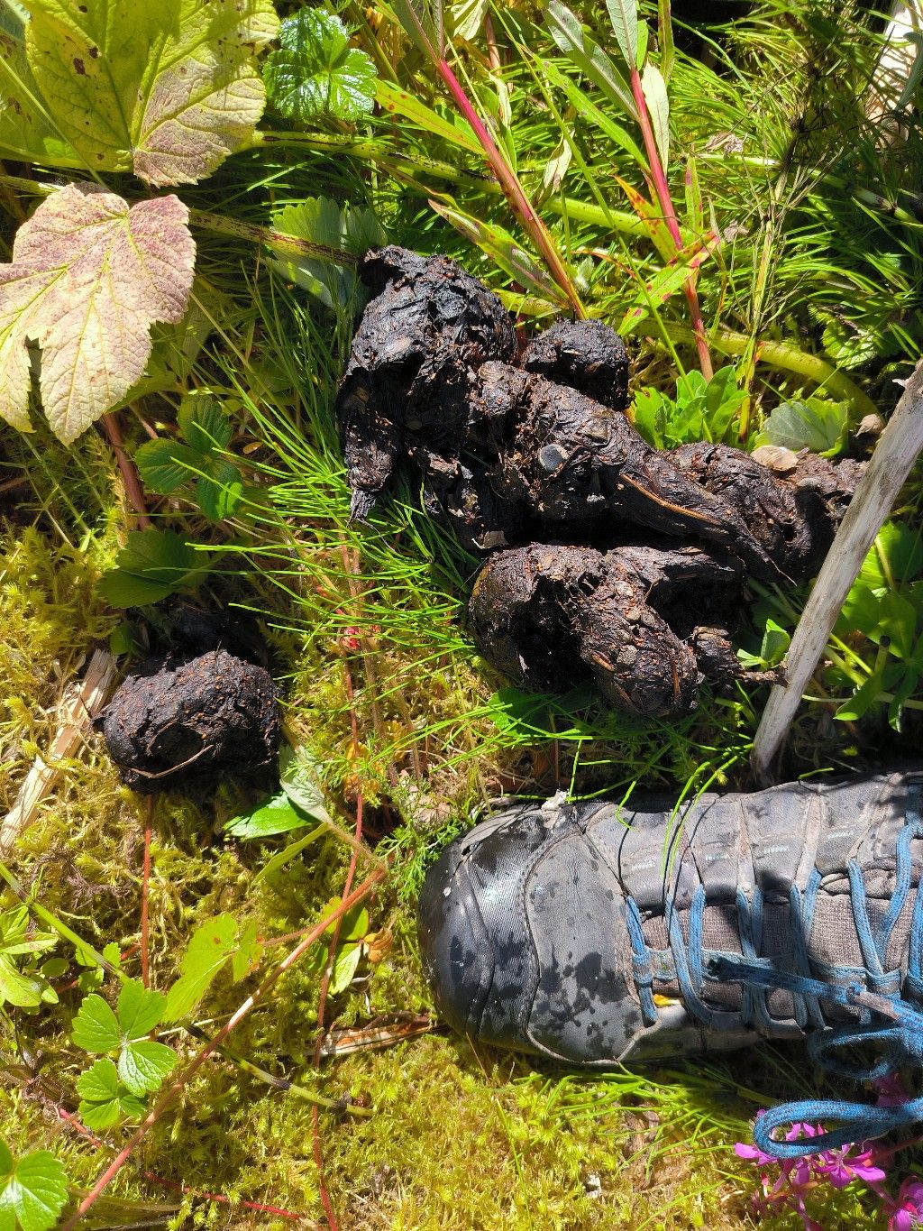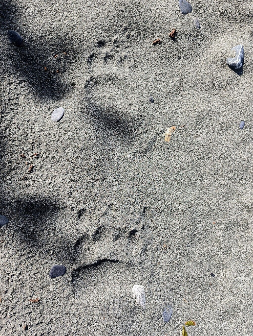 Am Strand verläuft ein richtiger Highway der Tiere. Anscheinend ist der schmale Streifen zwischen Beerensträuchern und Flutsaum genau richtig, um zu beiden Seiten nach Nahrung zu suchen. Wir sehen Unmengen von Bärenspuren im Sand, Hufe vom Elch, aber auch Wölfe sind hier gelaufen. Wir fügen unsere Fußabdrücke hinzu, zweimal Keen und zweimal Salomon. Kein Krümel Müll am Strand – sehr erfreulich ! Für den Rückweg entdecken wir einen Weg querfeldein, nicht unbedingt eine Abkürzung, aber spannend wegen der Einsamkeit und Bärennähe.