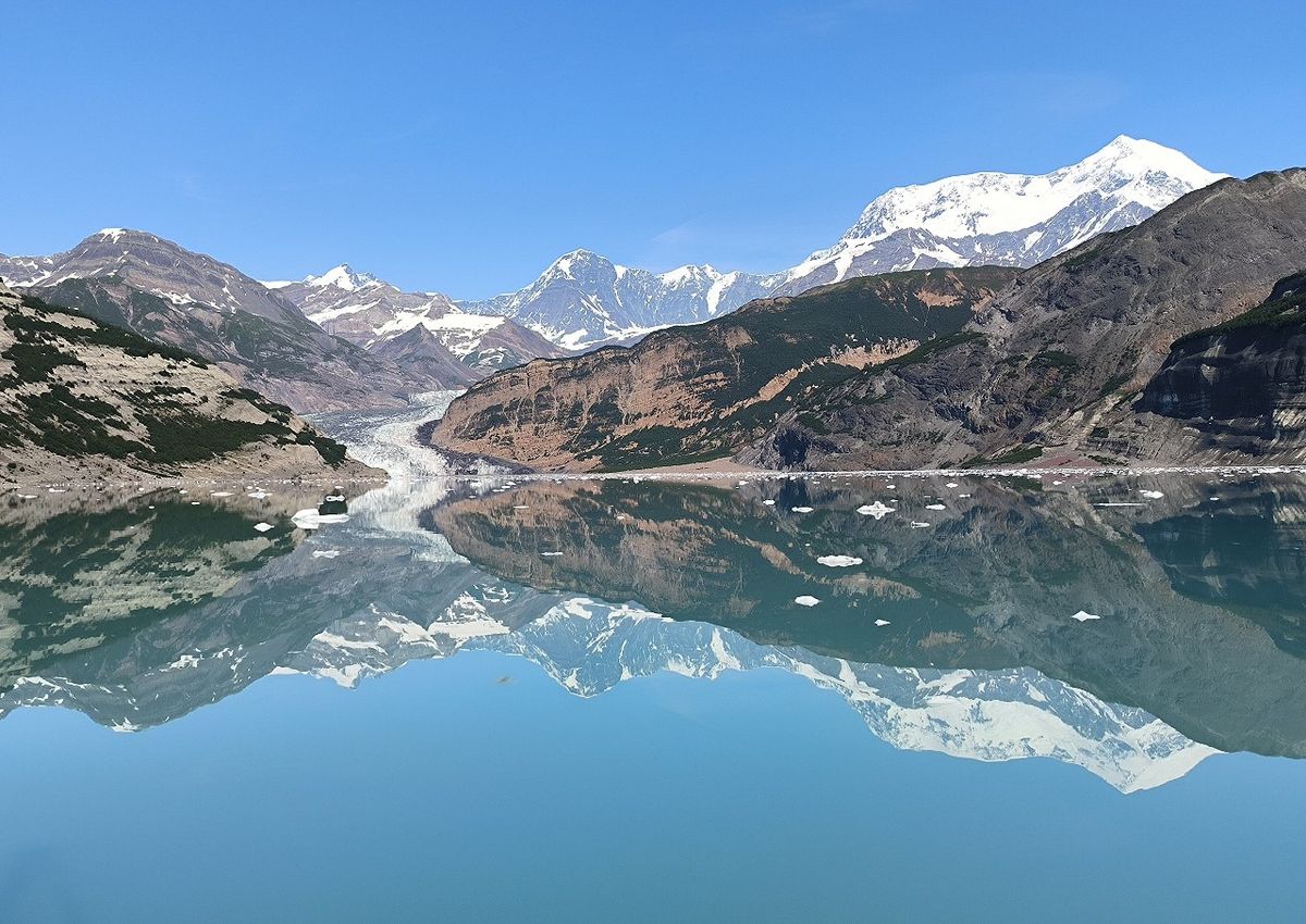 Das Bilderbuch-Wetter macht den Tag im Fjord zu einem besonderen Genuss. Der Weg ist weit, aber der Anblick vom Gletscher mit seiner Moräne und der Kulisse der Elias-Gebirgskette ist einmalig schön. Diese spektakuläre Landschaft spiegelt sich zudem im ruhigen Wasser, als wäre es ein Motiv für Kitsch-Postkarten.