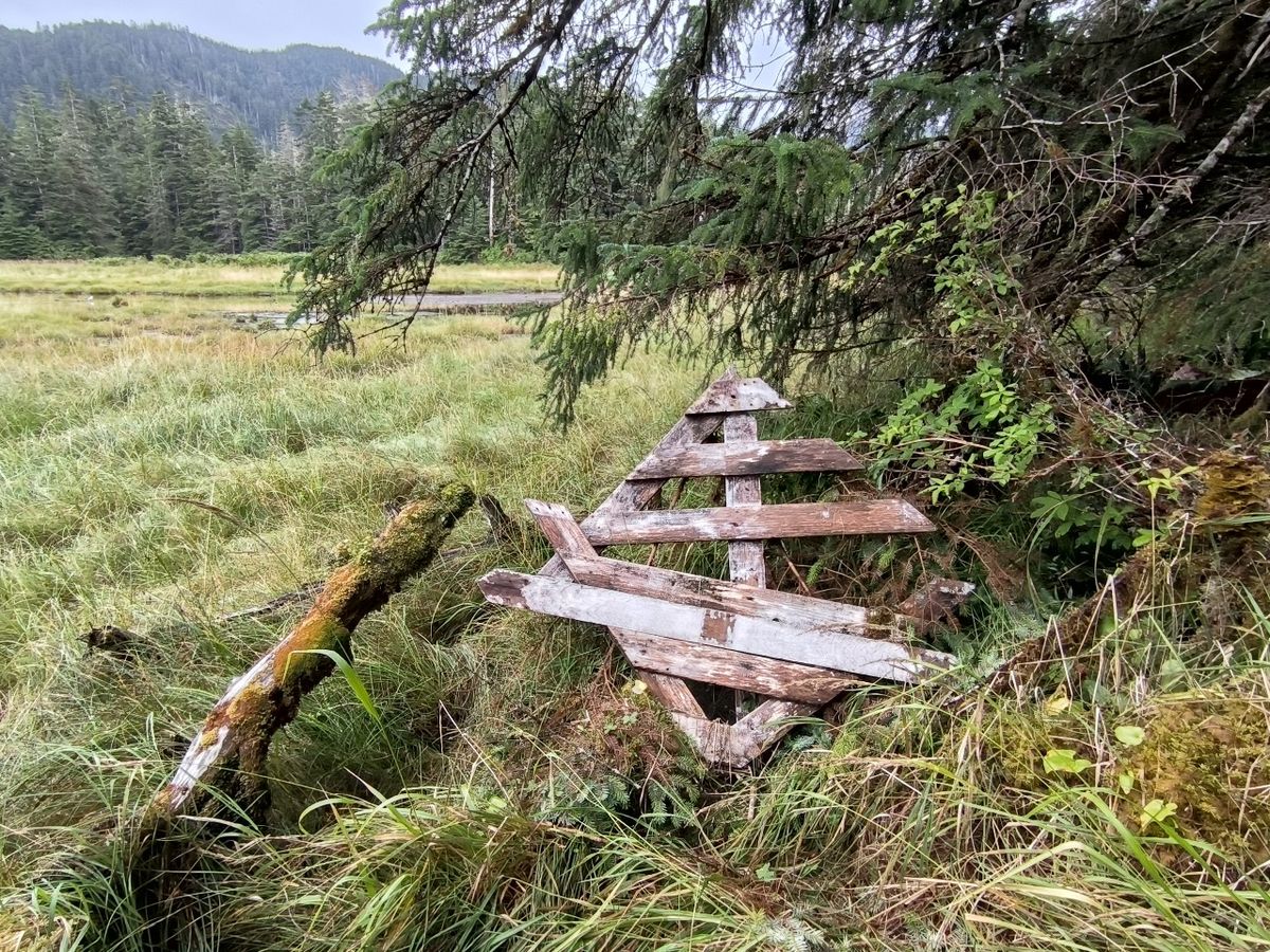 Von der Kalinin Bay gibt es einen Trail bis zur Sea Lion Cove. Schon wieder Nieselregen, aber wir gehen trotzdem los. Der Weg führt zunächst am Ufer entlang, nass und matschig, wie zu erwarten war. Man könnte hier tagaus und tagein mit Gummistiefeln laufen, wenn das nicht so rutschig wäre. Tatsächlich finden wir ein Zeichen, welches zwar kaputt am Boden liegt, aber ganz eindeutig den Anfang des Trails markiert. Es geht zunächst bergauf in den Wald, dann vorbei an einem See. Im Sand am Ufer sind Bären-Spuren und Hufabdrücke vom Sitka-Hirsch. Wir sind ziemlich begeistert. Das ist wirklich ein schöner Trail, obwohl man im Internet nachlesen kann, dass er seit 2015 aus Kostengründen nicht weiter unterhalten und gepflegt wird.