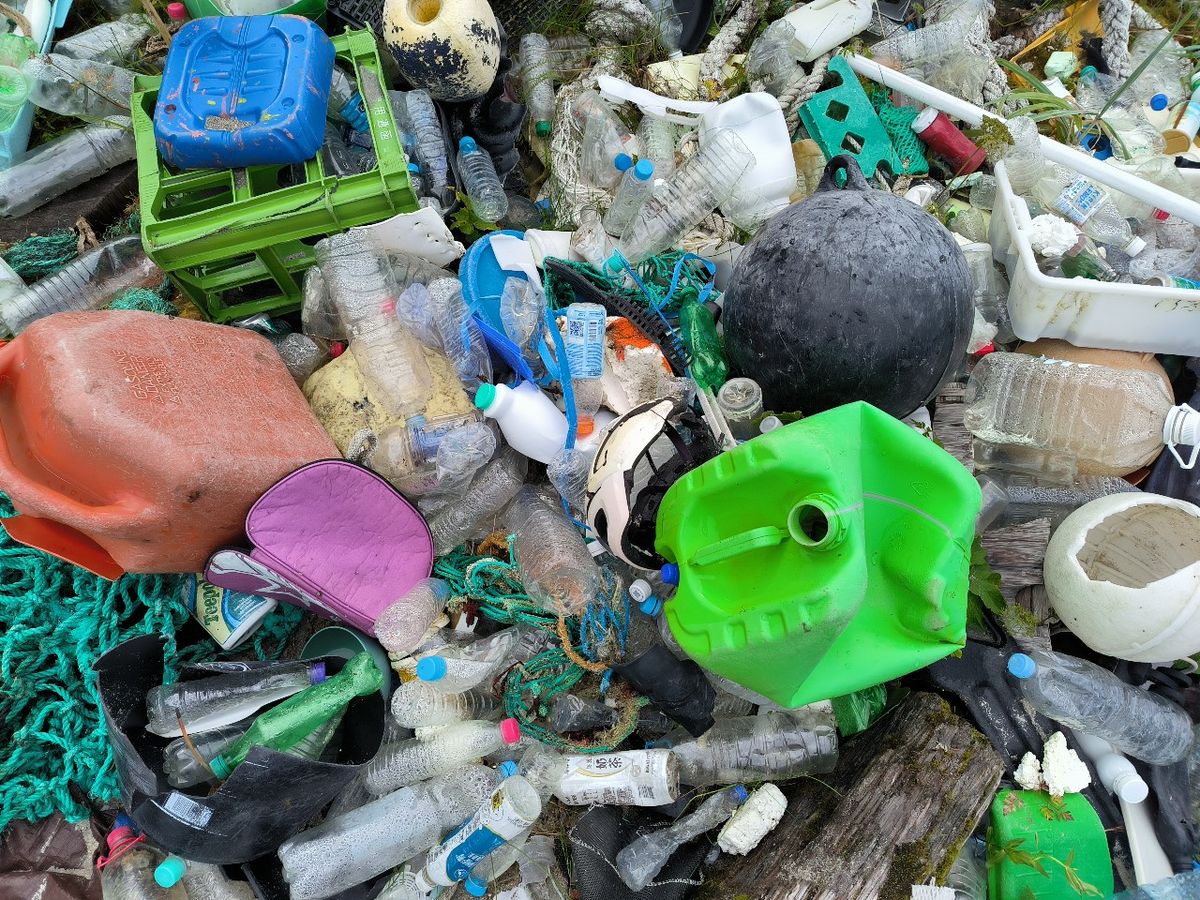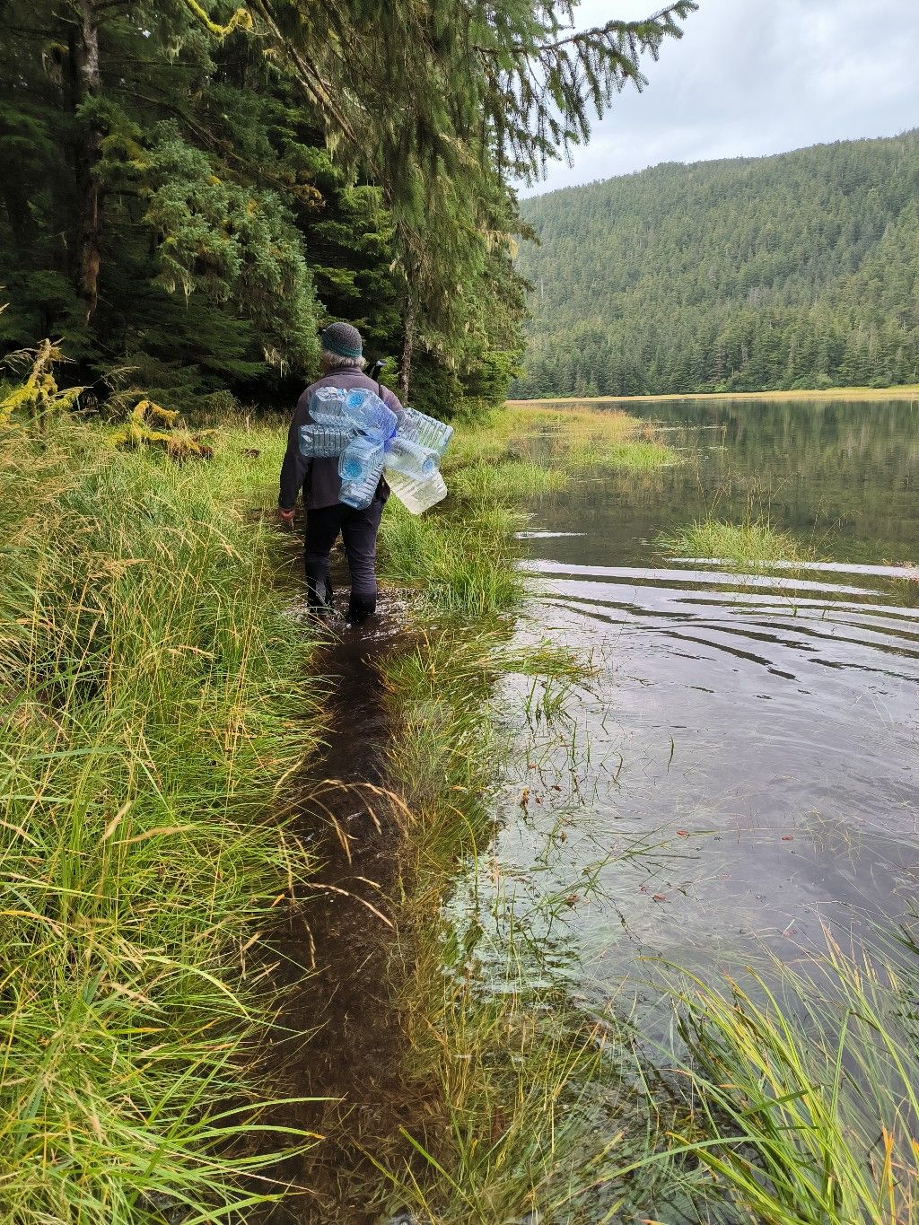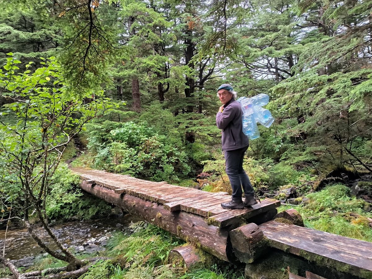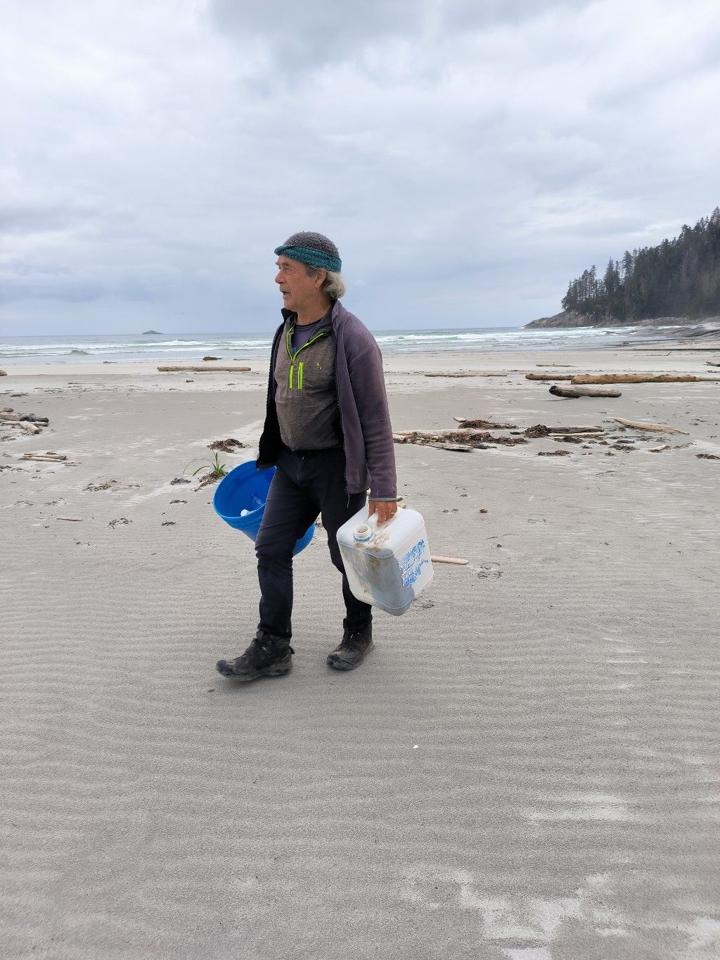 Am Ende des Trails erwartet uns ein langer Strand mit weißem Sand und sehr viel angeschwemmten Bäumen. Die Sea Lion Cove liegt an der Außenseite zum Pazifik. Richtige Wellen schlagen an den Strand. Da gibt es eine Feuerstelle, Tisch und Hocker sowie weitere Zeichen menschlichen Lebens. Sehr viel Plastikmüll wurde zusammengetragen und auf einem Haufen gesammelt. Gute Idee. Wir machen mit und heben auf, was wir an Plastikflaschen etc. am Ufer finden. Hoffentlich wird das Zeug irgendwann abgeholt. Wegen unseres ausgelaufenen Kühlwassers brauchen wir einige Kanister und finden sie auf der Plastik-Müllhalde. Trifft sich gut. Insgesamt 8 große Wasserflaschen, heile und mit Deckel, nehmen wir mit und tragen sie über den Trail.