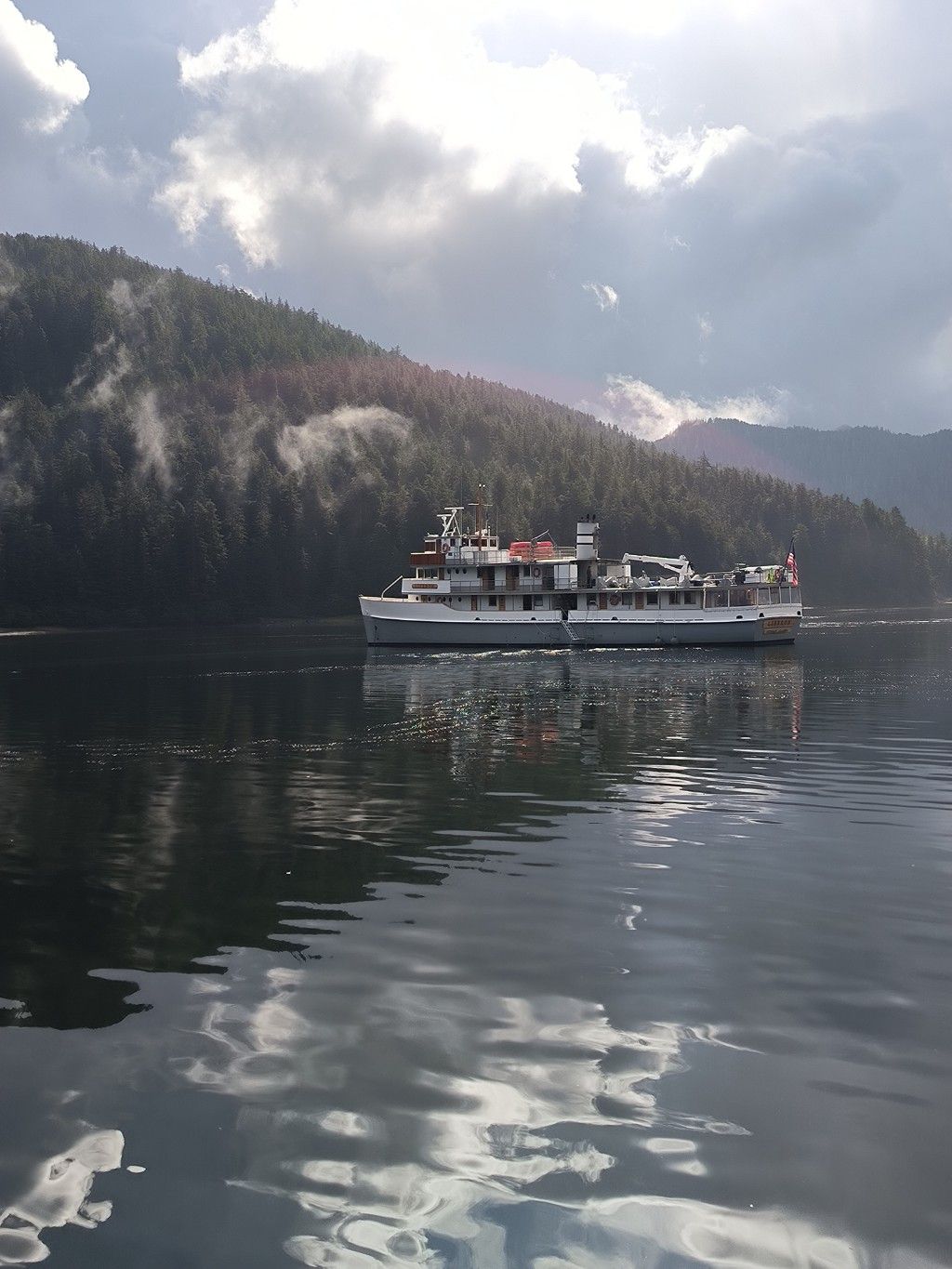 Am nächsten Morgen ist alles wieder friedlich. In unserer Bucht liegt ein kleines Kreuzfahrt-Schiff. Die „Liseron“ ist ein Motorboot von 45 Meter Länge. Ein Mann grüßt zu uns hinüber, anscheinend der Wachhabende, der an Bord bleiben musste. Die Passagiere sind offensichtlich an Land. Ob die wohl gerade den Trail zur Sea Lion Cove laufen ? Das ist ja eine Horror-Vorstellung für uns. Wir auf diesem einsamen Pfad in der Wildnis unterwegs in dem Glauben, dass wir ganz alleine sind ….. Und dann kommt uns eine geführte Wanderung mit 50 Personen entgegen. 😉