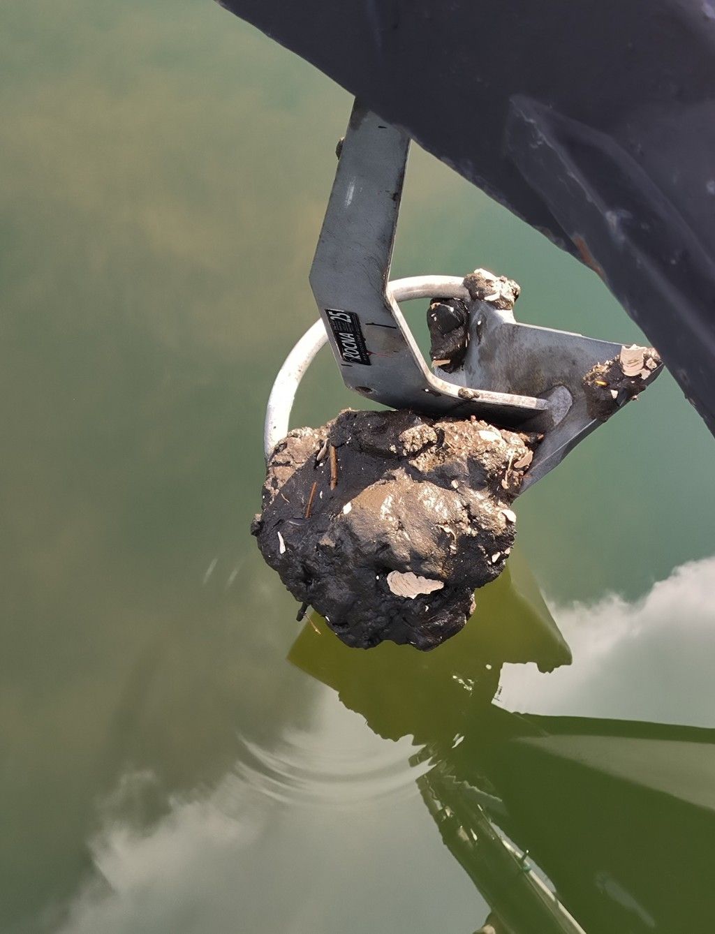 Der Anker will den Grund nicht loslassen. Wir hatten wirklich sehr viel Wind, viel Druck auf der Kette und einen guten Haltegrund. Als der Anker uns endlich freigibt, da hängt er voll mit schwarzem Schlick.