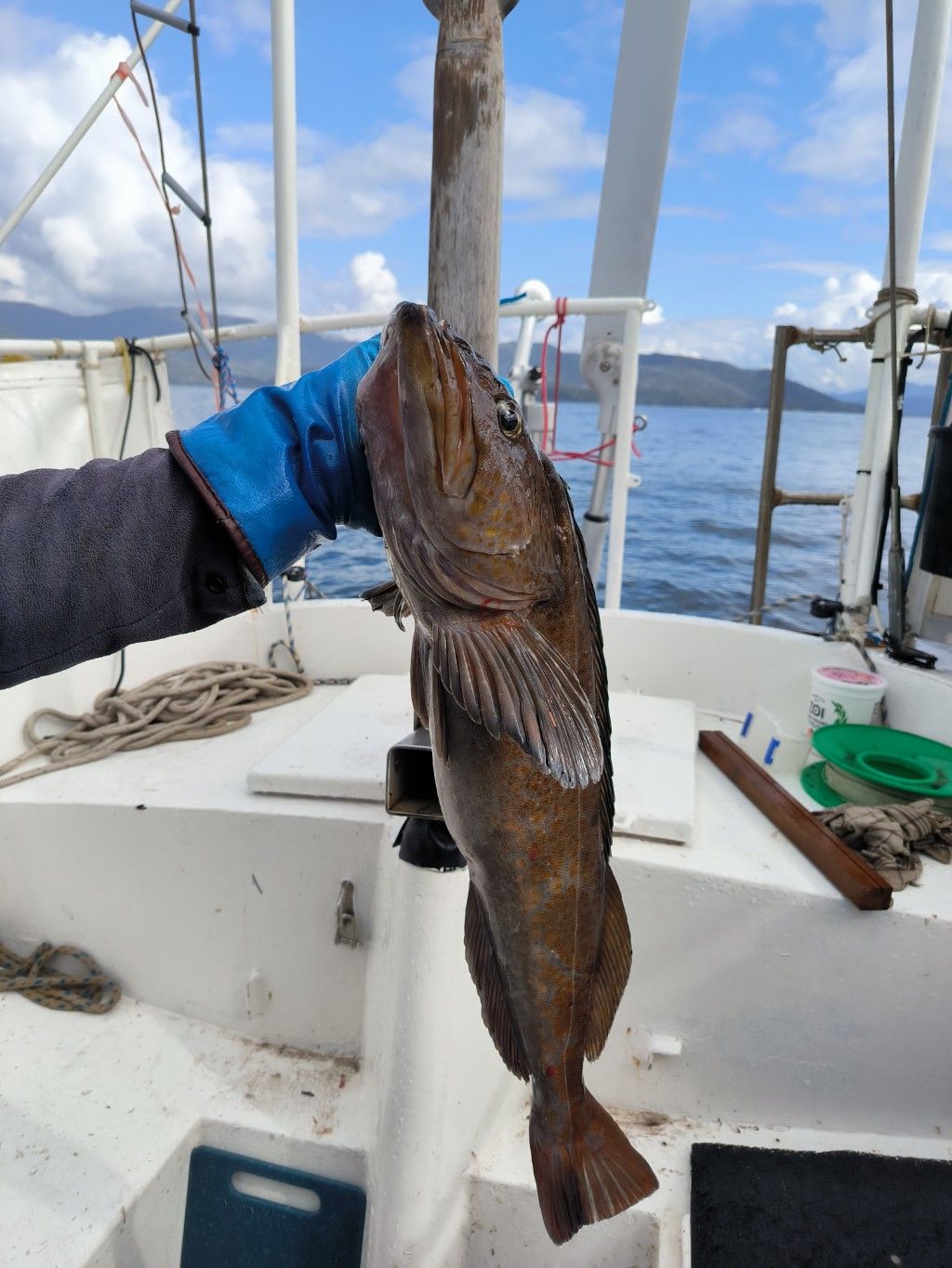 Start um 11.15 Uhr bei Niedrigwasser. Wir fahren zunächst nur eine Meile bis zum Angelstopp. Innerhalb von 10 Minuten haben wir einen Lingcod an der Angel. Ich muss mit dem Gaffelhaken zu Hilfe kommen, um den dicken Brocken an Bord zu hieven. Damit ist das Angeln für heute und morgen erledigt. Dieser Fisch reicht auf jeden Fall wieder für zwei Tage. Vom kleinen Kruzof Island geht es nun weiter nach Baranof Island.