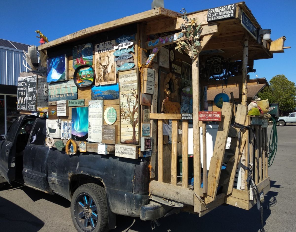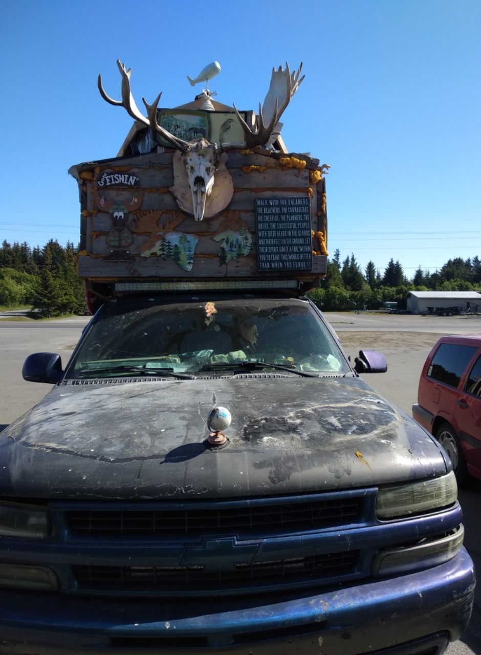 Sonntag gönnen wir uns eine Dusche. Vor dem Wash Board steht ein kurioses Fahrzeug, umgebaut zum Wohnmobil mit Balkon. Wir quatschen eine ganze Weile mit dem Fahrer. Er sammelt Schilder und ist gerade dabei, den Innenraum seines Wagens zu plakatieren. Höflich fragt er uns nach 10,- € Zuschuss zu seinem Unternehmen, die wir ihm gerne geben. Ein echtes Unikat !