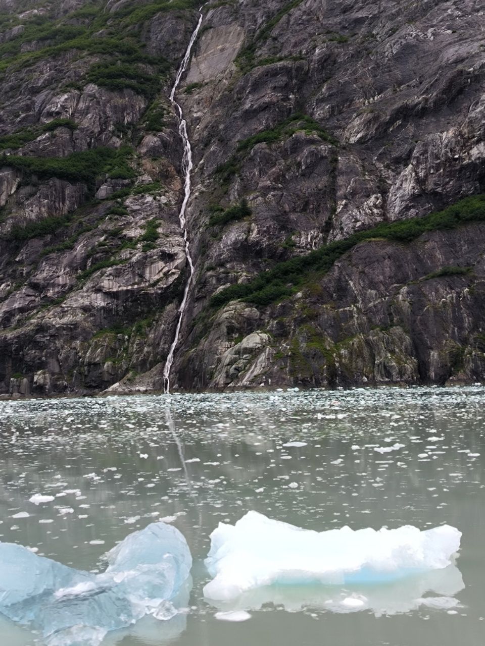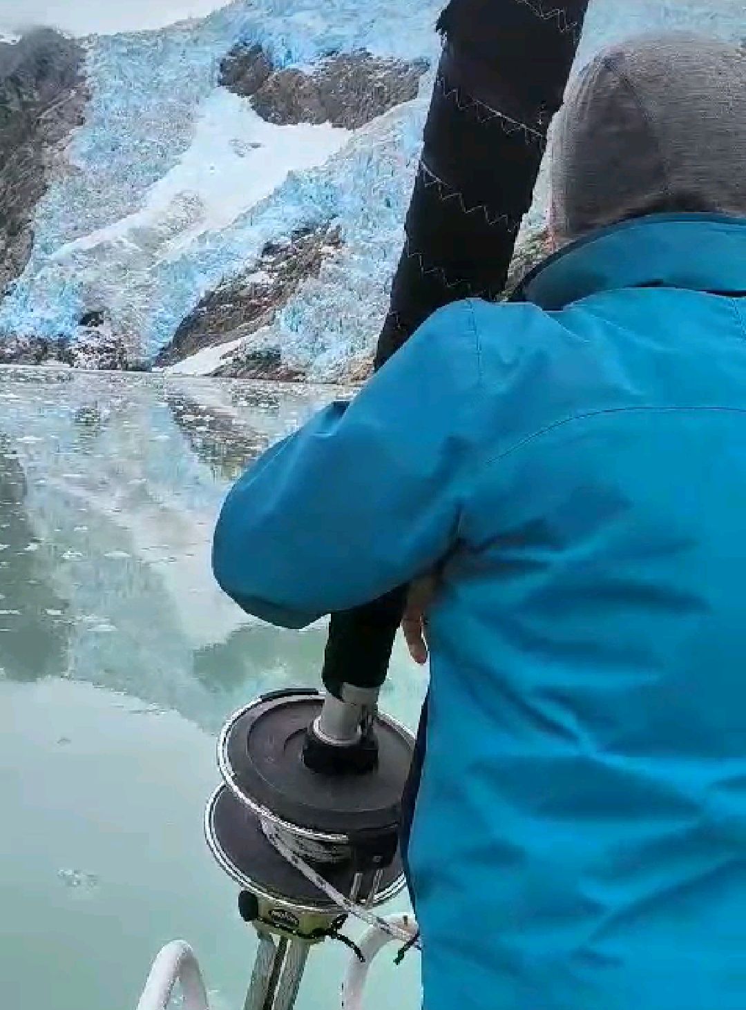 Es rumpelt und knallt unheimlich in der Wand vor uns. Wir können mehrere kleine Abbrüche beobachten. Durch den langen Weg bis zum Wasser wird das Eis gemahlen und rieselt wie ein Wasserfall bergab. Unten kommen nur kleine Brocken an und werden wie auf einer Straße aus dem Fjord gezogen.