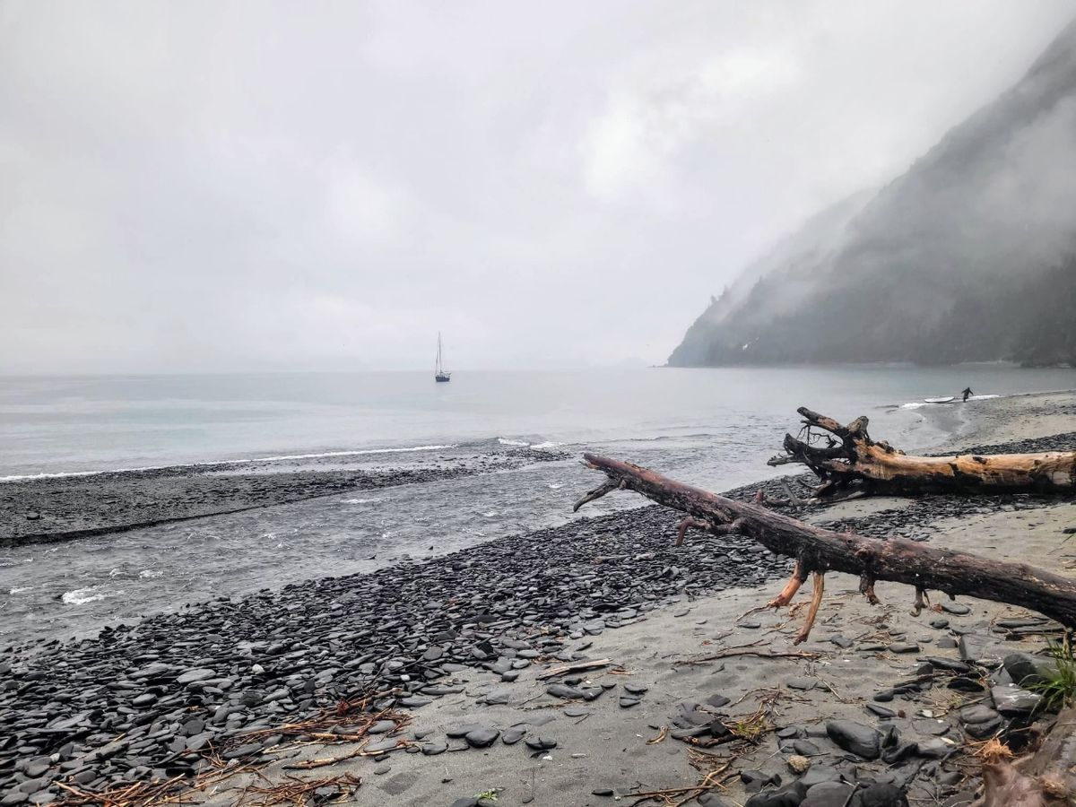 Es ist fast windstill, wir liegen gut am Ankerplatz. Hartnäckiger Dauerregen am Dienstag, und wir bleiben zu Hause. Hin und wieder klopft ein Eisbrocken an den Rumpf, aber nur kleine Stücke. Kein Grund zur Beunruhigung.