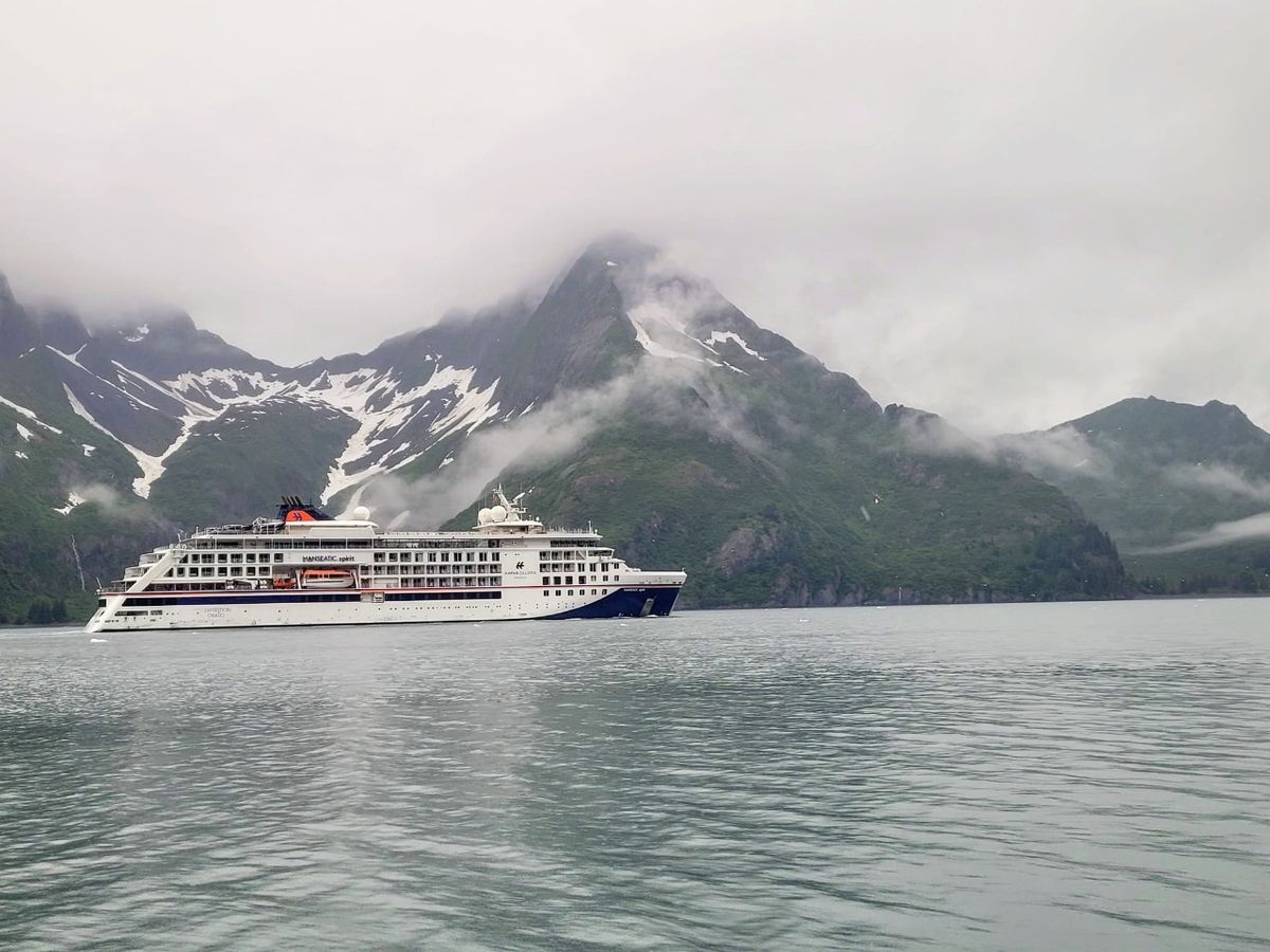 Nachmittags haben wir genug vom schlechten Wetter und starten in Richtung Aialik Gletscher. Einige Motoryachten kommen aus dem ersten Fjord, an dessen Ende ebenfalls ein Gletscher liegt. Vielleicht lohnt es sich ? Zeit genug haben wir. Kurz entschlossen biegen wir in den ersten Arm ein, der zum Holgate Gletscher führt. Uns kommt die 140 Meter lange „Hanseatic Spirit“ entgegen. Ein Kreuzfahrt-Schiff für bis zu 230 Gäste. Der Personalschlüssel dazu : Die Crew besteht aus 170 Personen. Letztes Jahr in der Nordwest-Passage sind wir der Hanseatic Spirit mehrmals begegnet. Preis pro Person AB 12200,- Euro für die 14-tägige Reise von Seward bis Vancouver. PLUS Kosten für Flug, Anreise nach Seward, Abreise aus Vancouver, Übernachtungen im Hotel. Das bekommen wir billiger hin. Dauert nur etwas länger, und wir sind unser eigenes Personal. 😉