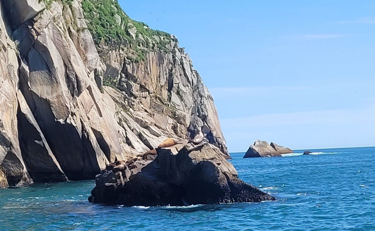 Bei der Einfahrt in die Resurrection Bay kommen wir an einer hohen Felseninsel vorbei, die anscheinend nur von Vögeln bewohnt wird. Gleich daneben schaut ein Felsen aus dem Wasser, auf dem sich etwa ein Dutzend Seelöwen tummeln. Sie ruhen sich aus, aber streiten und brüllen auch ordentlich. Die obligatorische Angelpause beschert uns heute zwei Kelpgrünlinge und einen Rockfish.