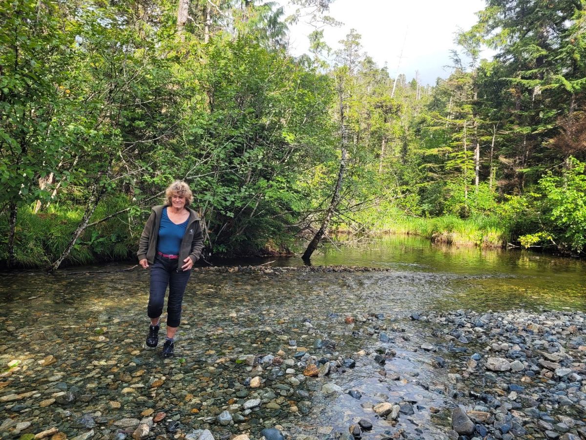 Wir machen uns auf den Weg, das bedeutet, wir suchen rings um die Hütte eine brauchbare Spur. Es fängt an zu regnen, ich bin wenig begeistert. Alles nass und sumpfig, binnen 10 Minuten haben wir nasse Schuhe und Strümpfe. Keine Anzeichen für einen begangenen Pfad. Fließendes Wasser von oberhalb des Hanges schneidet uns den Weg komplett ab. Entweder wir müssen umkehren oder durch. Unsere Füße sind sowieso nass, wie stapfen mit Schuhen in den kalten Bach. Nicht ganz so schlimm wie bei der Soapstone Cove, nicht bis zum Oberschenkel, sondern nur knöcheltief. Eine Weile folgen wir dem Verlauf des Wassers, queren auf die andere Seite, suchen dort in allen Richtungen. Dann wieder zurück ans gegenüberliegende Ufer, aber dieser weitere Versuch verläuft ebenfalls im Sande bzw. im Wasser. Auf dem Hinweg gab es einen unscheinbaren Abzweiger nach links, auf dem Fußabdrücke im Matsch zu erkennen waren. Letzte Möglichkeit, das probieren wie auch noch aus. Fehlanzeige. Auch diese Spur versickert im Nirgendwo. Wir haben keine Ahnung, wo der Trail sein soll und wie sein Verlauf ist. In diesem Gelände sieht alles gleich aus, Internet haben wir hier natürlich nicht, und unsere Wander-Apps zeigen auch nichts an. Völlig aussichtslos. Vielleicht ist es auch ein bisschen gefährlich, am späten Nachmittag hier herumzuirren. Wir treten den Rückzug an.
