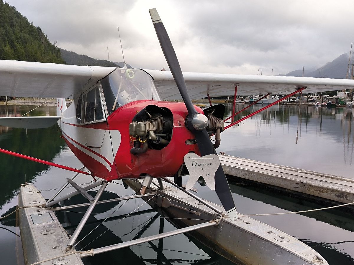 Eine Box im Hafen ist mit einem kleinen Wasserflugzeug besetzt. Es bietet nur Platz für 2 Personen. Das Besondere daran ist ein selbstgemaltes Schild mit der Info : „Der Zahnarzt ist jetzt da.“ Das ist ja nun wirklich kurios. Für mich ist es das Beste an Pelican. 😉