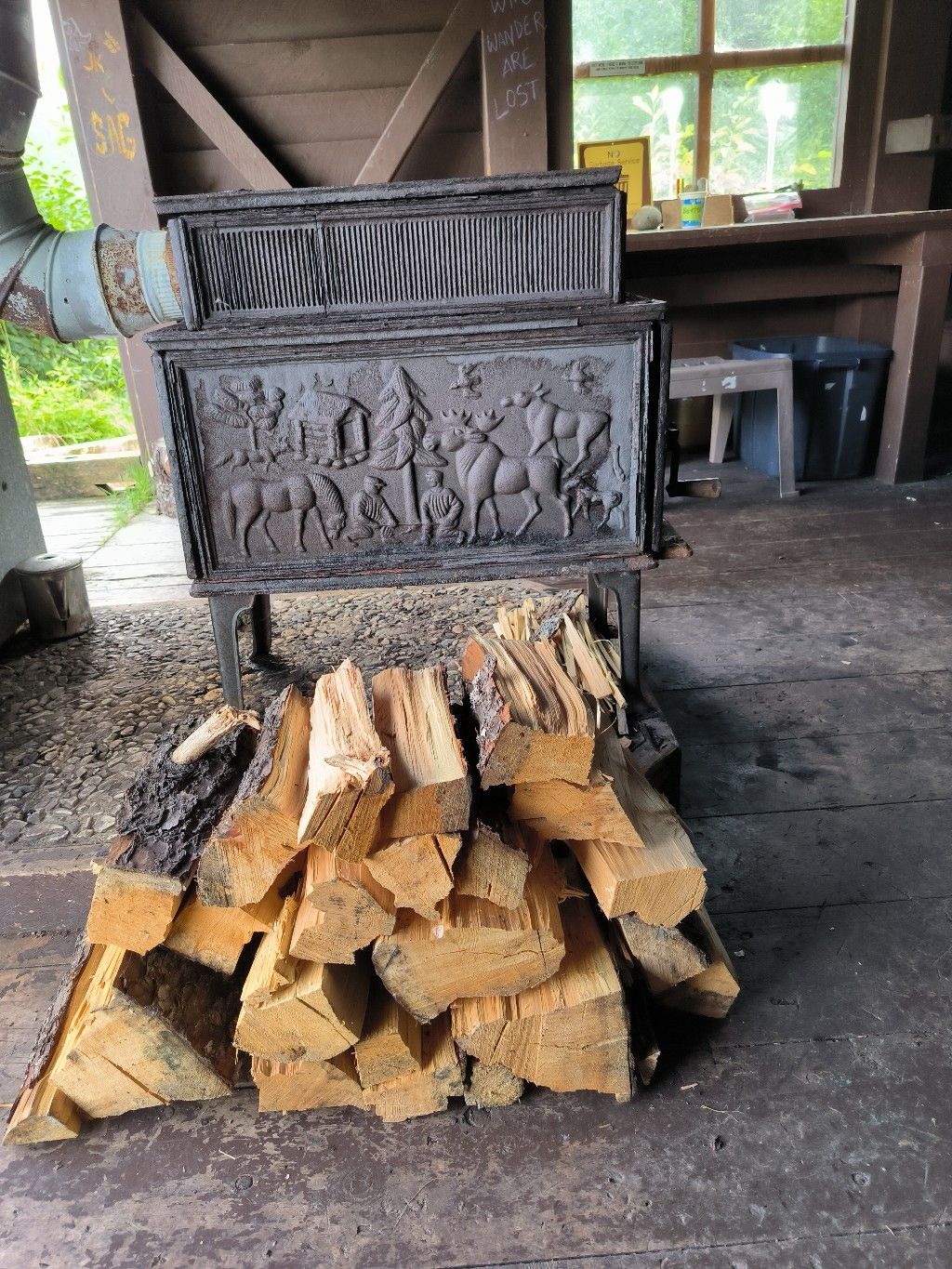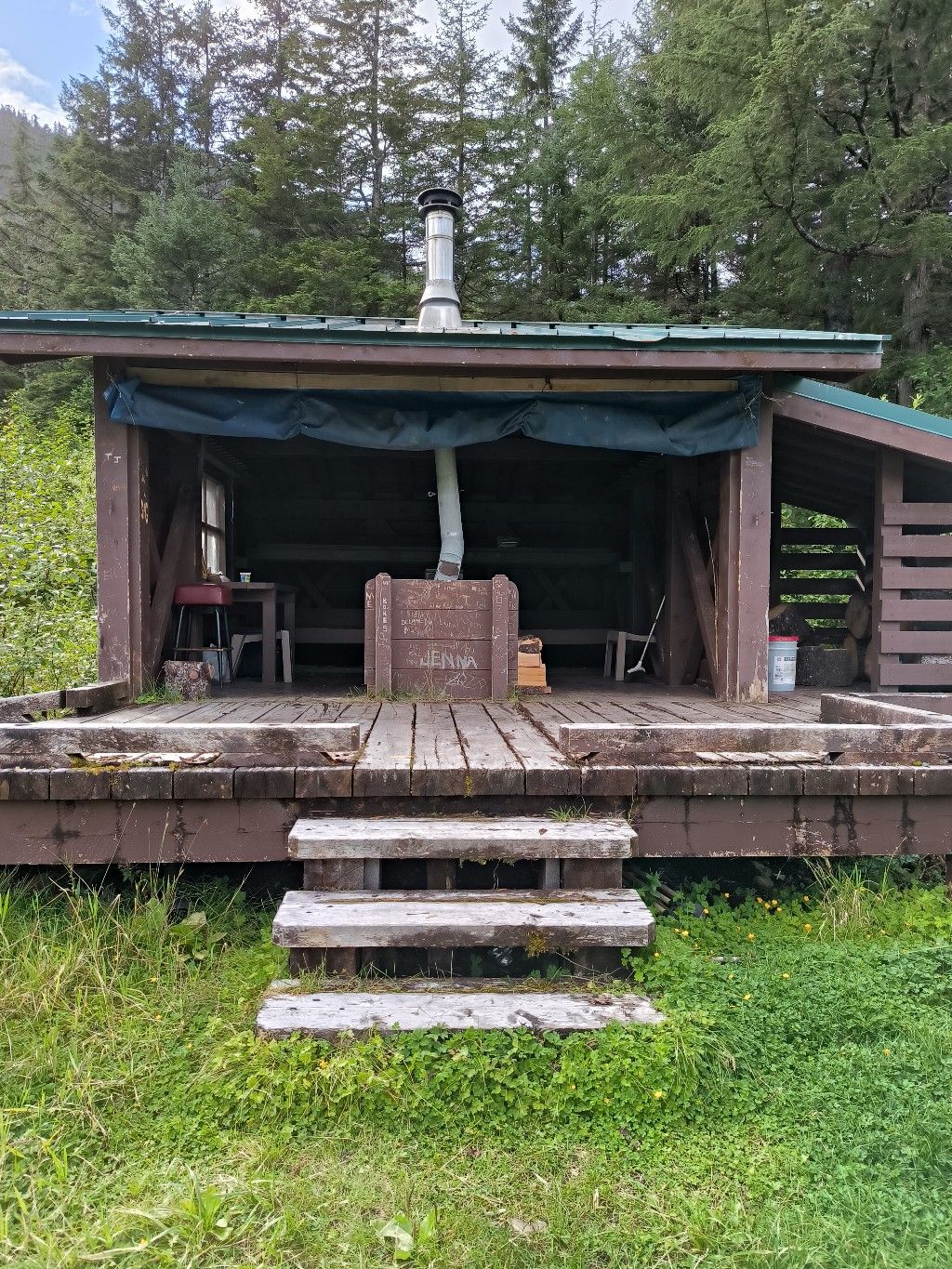 Tatsächlich steht da ein verwittertes Schild vom USNF ( National Forest ). Daneben eine sehr gut erhaltene Shelter mit festem Vorhang zum Schutz vor Bären, mit Ofen und Brennmaterial. Ein paar Meter weiter finden wir das Privy, eine Komposttoilette, wie sie überall auf den Trails zu finden ist. Wir sind echt erstaunt. Nicht nur, weil wir nichts von diesem kostenlosen Anleger wussten, sondern weil hier eine Wanderung möglich sein soll.