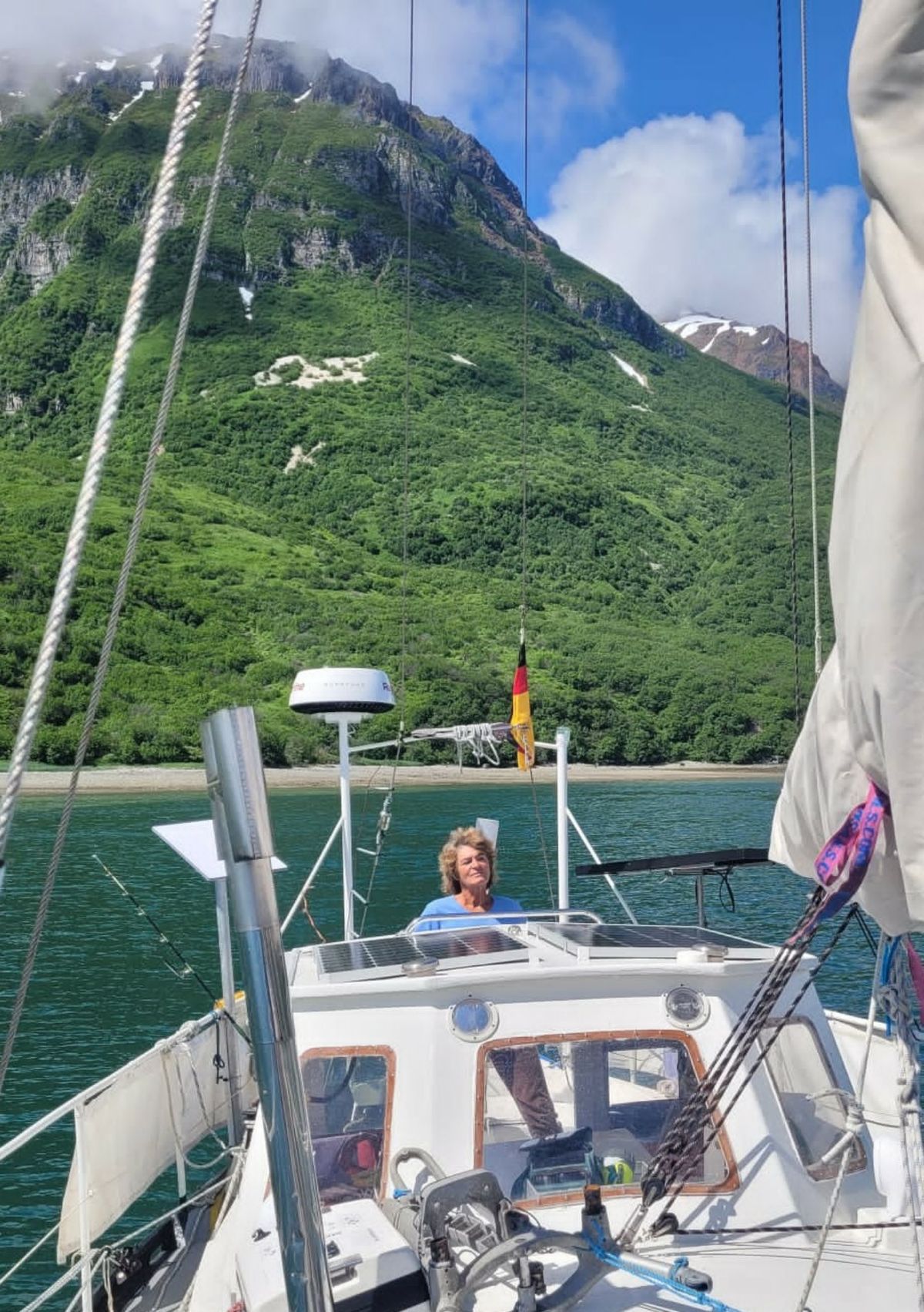 Mit ablaufendem Wasser kommen wir gut aus der Amalik Bay bis in die Shelikof Strait. Dort erwartet uns angenehmer Wind mit 4 Bft. aus Ost. Sofort können wir das ungereffte Groß setzen, die Genua auf Steuerbord dazu und Windsteueranlage dran. Wunderbar, wir laufen mehr als 5 Knoten, und das bequem.Wir möchten nach Kodiak Island hinüber und uns einen Ankerplatz in der Uyak Bay suchen. Das ist kein Neuland, denn dort haben Beth und Wallace ihr Ferienhaus sowie auf der benachbarten Harvester Insel deren Verwandtschaft. Halber Wind, schön beständig, kaum Welle, herrliches Segeln. Walkabout pendelt sich auf knapp 6 Knoten direkt auf der Kurslinie ein. Das wird eine schnelle Überfahrt. Den ganzen Nachmittag steuern wir auf die grandiose Kulisse von Kodiak zu. Die hohen Berge der Insel sind noch mit Schnee bedeckt.