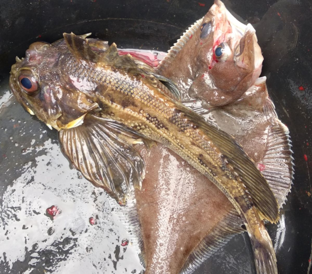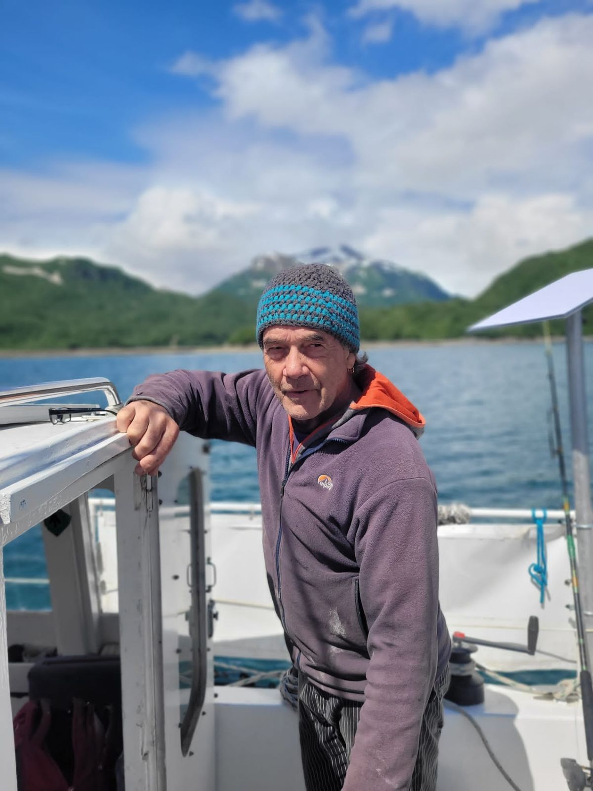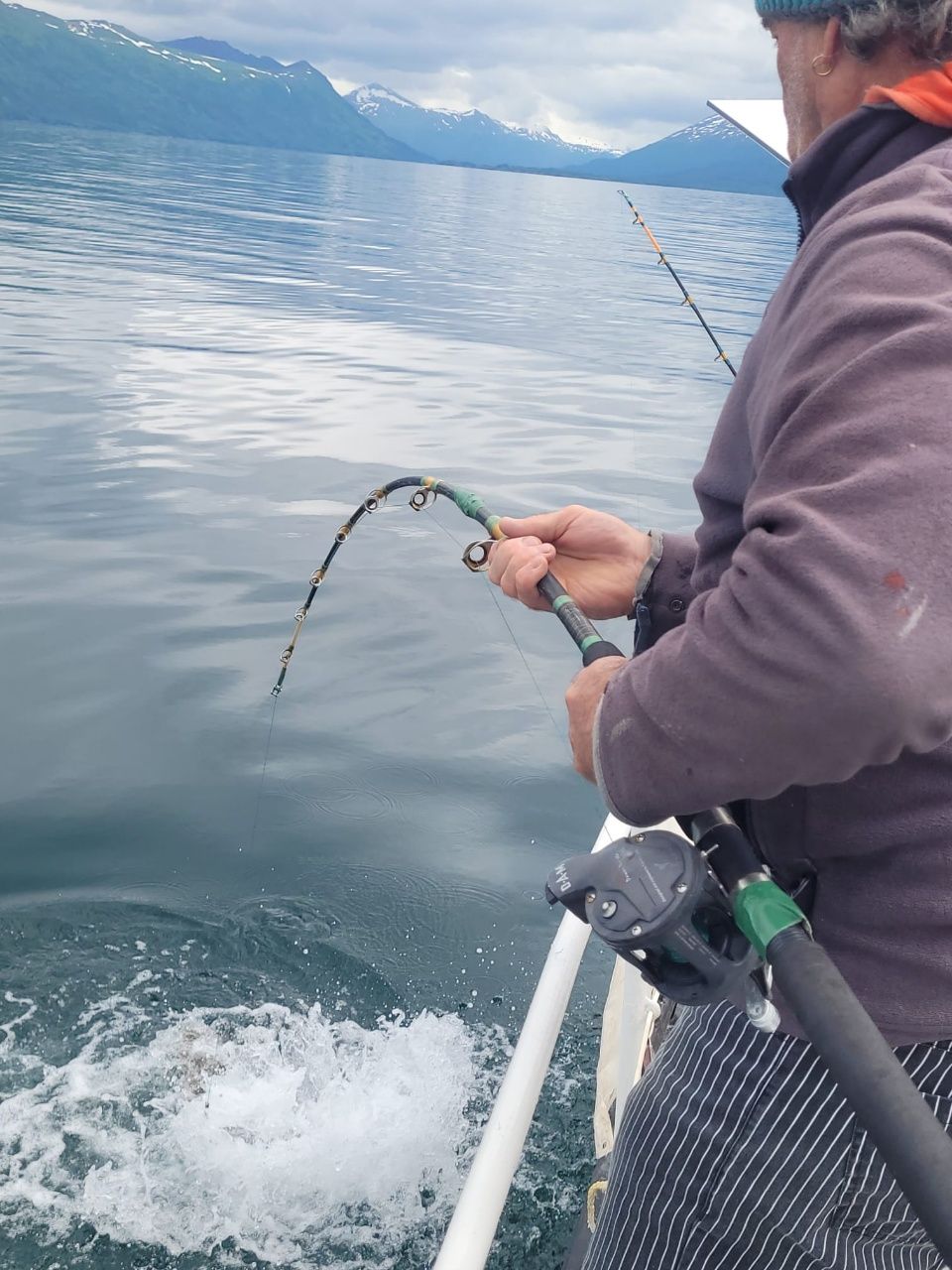 Am nächsten Tag ziehen wir schon kurz nach Mittag weiter Richtung Larsen Bay, wo wir hoffentlich Troy wiedersehen werden. Eigentlich sind wir zu früh, das ablaufende Wasser fließt uns entgegen. Aber wir möchten trödeln und unterwegs Angelpause machen. Gestern gab es ( ganz bewusst ) keinen Fisch. 😉 Kaum ist die Angel auf Grund, da spüren wir den ersten Biss. Ein schöner Lachs, der es sich aber leider anders überlegt und verabschiedet. Der nächste Fisch ist ein fetter Heilbutt. Thomas ruft schon nach dem Gaffelhaken, aber mit dem letzten Schwung Richtung Cockpit geht uns der Fisch verloren. Zu früh aus dem Wasser gehoben. Der dritte Biss ist ein Heilbutt normaler Größe, und dieser landet bei uns im Eimer. Keine 5 Minuten später geht ein Rockfisch an den Haken – haben wir noch nie zubereitet, aber die sollen sehr lecker sein. Das nächste Zucken der Angel bringt uns einen dicken Heilbutt, ein weiterer folgt sogleich. Damit sollte es eigentlich genug sein, aber wir haben noch viel Zeit, und der Käpt’n mag nicht aufhören. Die Quittung folgt sogleich. Unsere Angel biegt sich enorm durch, wir müssen zu zweit festhalten. Mit dem Gaffelhaken und enormer Kraftanstrengung bringt Thomas einen riesigen Heilbutt an Bord, der nicht viel kleiner ist als unser Monster-Fisch vor ein paar Tagen. Genug ! Für heute und morgen haben wir ausgesorgt. Angeln verboten. 😉