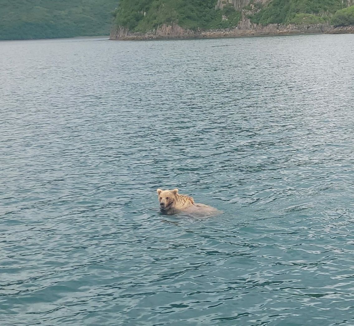 Viel Wind während der Nacht, aber Tendenz nachlassend. Sonntag ist ein trüber Tag mit Regen. Wir haben eigentlich genug Bären gesehen und nutzen die Tide am Mittag. Noch einmal kurz tuckern wir in die andere Bucht, um zu gucken, ob die Lachse am Start sind. Sieht nicht so aus, kein Getümmel an den Wasserläufen. Im Seeadler-Nest sitzen heute beide Elternteile, zwei weiße Köpfe und Hälse ragen auffällig aus dem Grün. Und dann glauben wir unseren Augen nicht zu trauen : Da schwimmt ein ausgewachsener Grizzly quer durch die Bucht. Wir halten langsam darauf zu und können ihn aus nächster Nähe beobachten. Er paddelt wie ein Hund, schnauft gelegentlich, sieht aber völlig entspannt aus. Irgendwann wird es dem Bären zu doof. Er dreht um und schwimmt hinter unserem Heck weiter in seine anvisierte Richtung. Kollisions-Verhütungsregeln scheint er zu kennen. Wir wollen ihn auch nicht ärgern, sondern fahren zurück. Das gibt’s doch nicht ! Voraus schwimmt schon wieder ein Grizzly, von einer Insel zur nächsten Insel. Soviel zum Thema : Im Dingi fühlen wir uns sicher. 😉 Die Bären klettern geschmeidig an Land, einer links und einer rechts, und schütteln sich den nassen Pelz aus. Beide sind ganz besonders hübsche Tiere, gut gewachsen, von mittlerer Statur und haben hellbraunes, fast blondes Fell. Wir sind total begeistert. Dieser Abstecher hat sich wirklich gelohnt, damit hatten wir überhaupt nicht gerechnet.