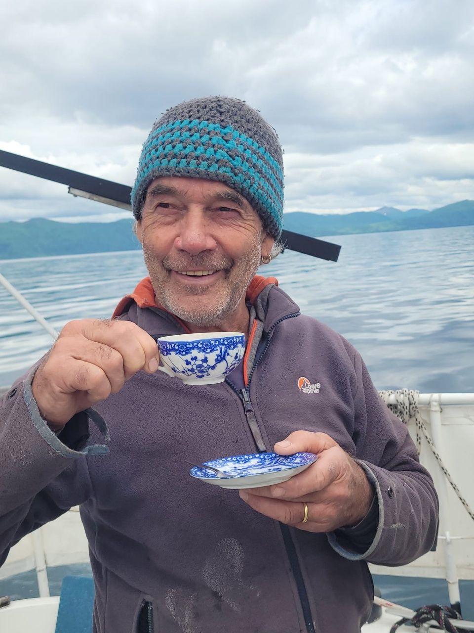 In der Zwischenzeit koche ich Wasser für unseren Nachmittags-Tee. Aufgrund der umständlichen Reise mit viel Gepäck haben wir diesmal weder Tee noch Kandis mitgebracht. Die Dose mit dem Ostfriesentee ist fast leer. Kluntje haben wir auch schon länger nicht mehr. Leider ist in Alaska wohl kein Besuch zu erwarten, der etwas aus der Heimat mitbringen könnte. Natürlich trinken wir unseren Tee aus Uromas gutem Geschirr, so schmeckt er am besten. Nach gut 4 Stunden erreichen wir die Fischfabrik, an deren Ponton die Walkabout letztes Jahr während eines Sturmtiefs mehrere Tage sicher vertäut war. Abends liegen wir total ruhig und einsam am äußersten Ende der Larsen Bay. Die Moskitos sind hier eine Plage, das hatten wir ganz vergessen.
