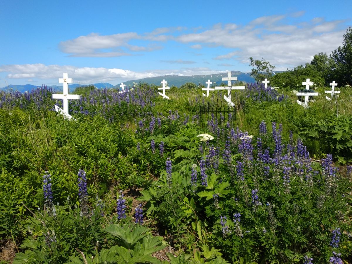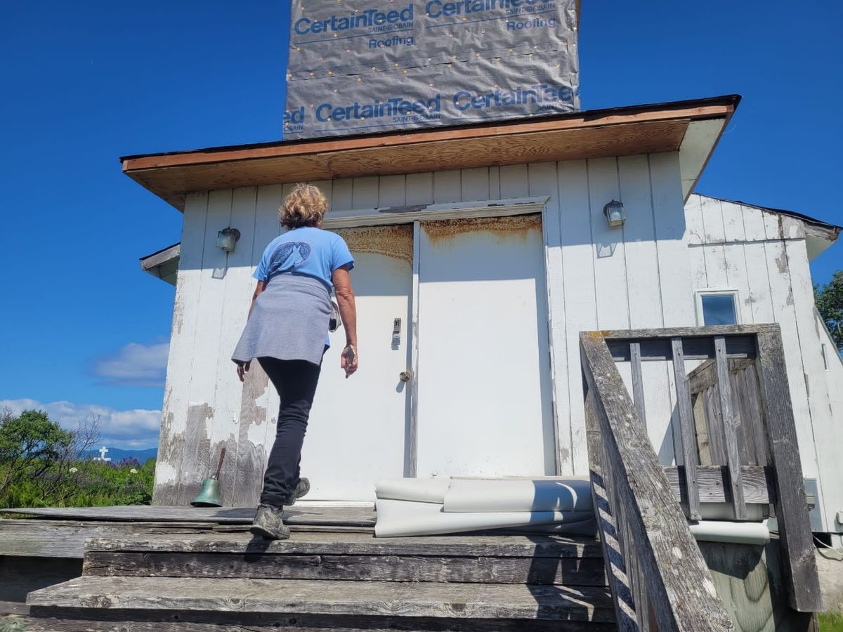 Ein Fuchs läuft durch’s Dorf, zweimal kreuzt er in Sichtweite die Straße. Der war schon im Oktober hier und schlich bei Troy um’s Haus herum. Wir laufen eine Runde durch Larsen Bay, aber es ist nicht besonders spannend. Letztes Jahr haben wir wegen Schlechtwetter einige Tage hier verbracht und sind jeden Weg mehrmals gelaufen. Kurzer Strand-Spaziergang, anschließend klettern wir über die Klippen eine Etage höher und schlagen uns über den zugewachsenen Friedhof bis zur Kirche durch. Die Tür steht offen, es sieht immer noch nach Baustelle aus, die Glocke liegt draußen am Boden. Kein Fortschritt bei der Renovierung erkennbar. Nichts Neues, es haut uns nicht um.