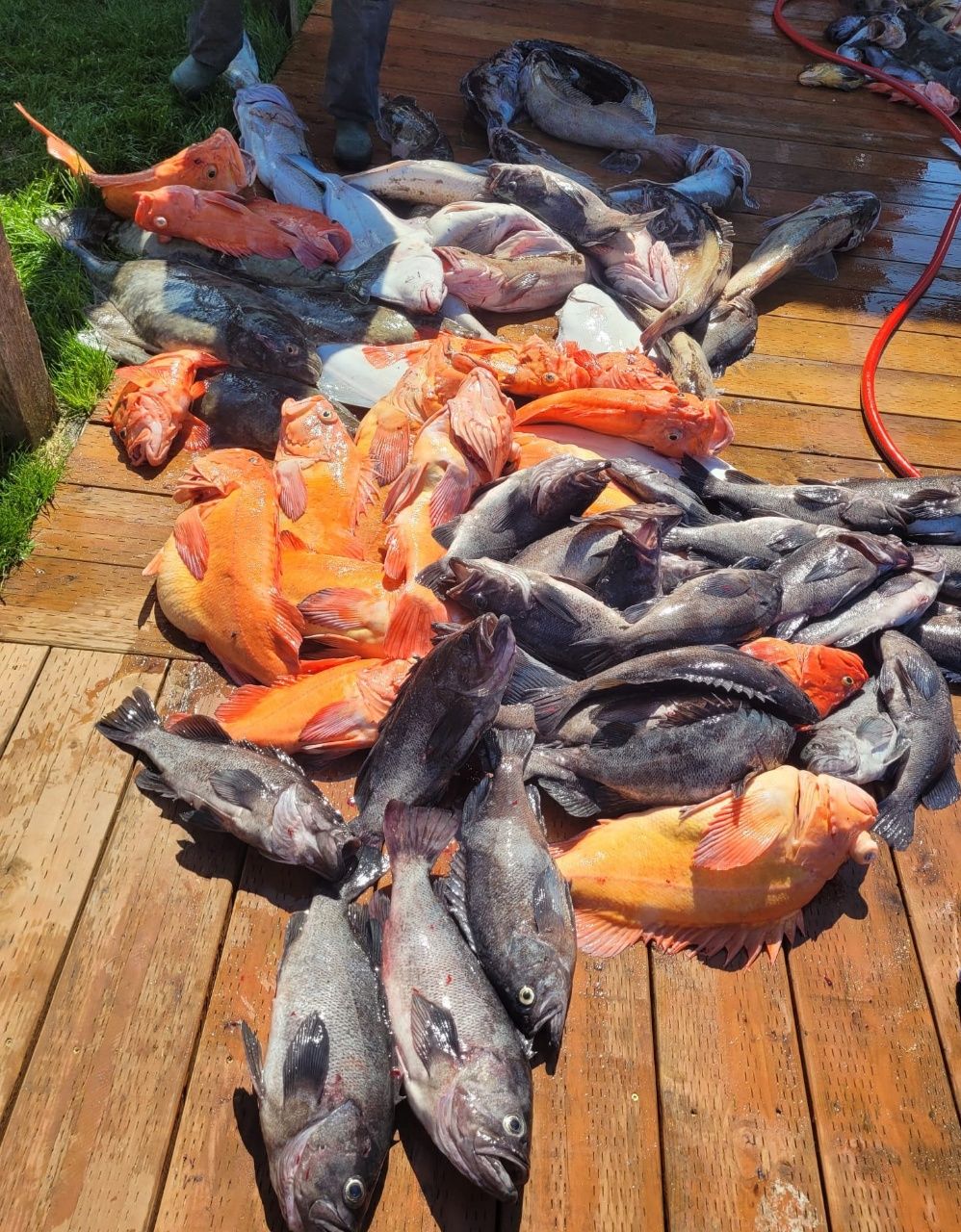 Ein weiterer Gang führt zur „Marina“, das ist ein kleiner Hafen mit Stegen im Schutz einer Steinmauer. Auf dem Weg dorthin liegt das Kodiak Island Resort. Gerade sind die Gäste mit einem schnellen Motorboot zurückgekommen. Sie haben reiche Beute gemacht und feiern ihren Erfolg. Eine enorme Auswahl ausschließlich großer Fische hängt am Haken. Der Fang aus den nächsten Tonnen wird einfach auf den Boden gekippt. Sehr beeindruckend, was die Leute mit professioneller Hilfe und starkem Motor innerhalb von ein paar Stunden aus dem Meer geholt haben. Aber – nein, danke – für uns heute bitte keinen Fisch. 😉