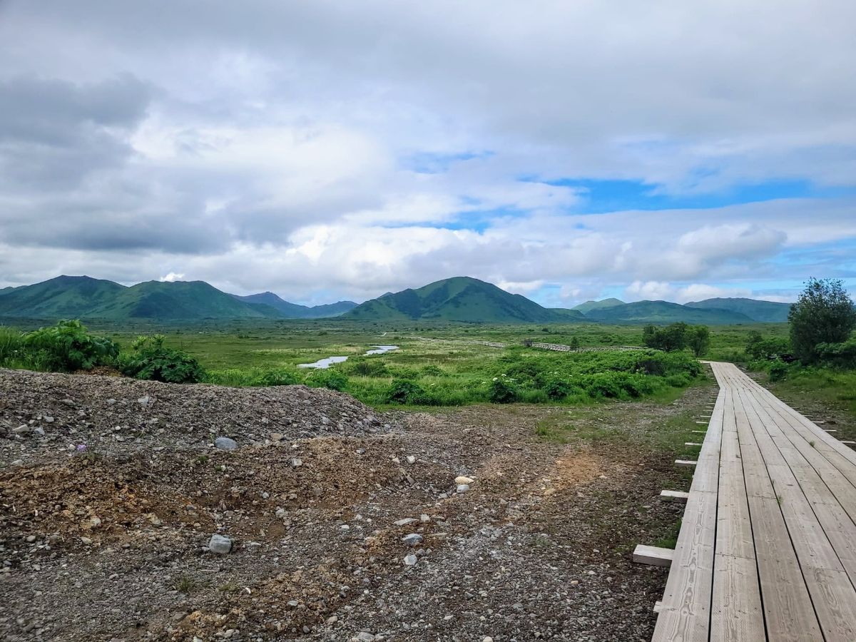 Morgens früh keine Bären, aber immerhin sind ein paar Rehe am Ufer zu beobachten. Wir sehen einen Reh-Kindergarten mit mehreren Jungen und 2 erwachsenen Tieren. Auf der anderen Seite läuft ein Paar mit einem ganz kleinen Kitz. Bei Niedrigwasser paddeln wir zum Strand und erkunden die nähere Umgebung. Ich bin wieder zu meiner bewährten Standard-Kleidung übergegangen, nachdem ich mir zwei Paar Turnschuhe versaut habe. Gummistiefel und Jogginghose habe ich in Grönland und in der Kanadischen Arktis lieben gelernt. Die erste halbe Stunde geht es matschig durch den Wald bergauf mit ungewissem Ausgang. Dann öffnet sich die Landschaft und ein ca. 3 Kilometer langer Board-Walk führt durch Sumpfgebiet bis zum Karluk River. Der Brettersteg wurde erst 2022 fertiggestellt und ist breit genug, so dass auch motorisierte Fahrzeuge ihn benutzen können. Muss ja nicht sein. Jetzt ist zum Glück nichts los, es ist noch keine Saison.