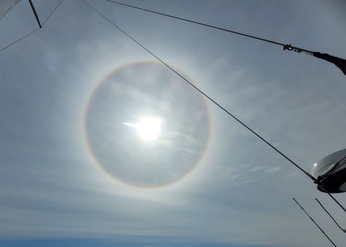 Sehr beeindruckend sind die Berge auf der anderen Seite der Shelikof. Die Gipfel im Katmai Nationalpark sind durchweg höher und tief mit Schnee bedeckt, manche sind noch zu Dreiviertel weiß. Mehrere Papageientaucher fliegen um uns herum. 2015 wurden sie als gefährdete Art eingestuft, hier in Alaska gibt es anscheinend noch einen gesunden Bestand. Thomas sieht zwei Wale gleichzeitig, einen voraus und einen achtern. Relativ kleine Exemplare, die schnell wieder untertauchen. Ein Wal kommt bis auf 10 Meter ans Boot heran, aber auch der verschwindet bald wieder. Später können wir noch einen weiteren Blas beobachten. Angelpause gegen Mittag. Thomas hat einen interessanten Köder geschenkt bekommen. Es soll ein „geheimer Köder“ sein, tatsächlich riecht der nach Fischmehl. Eigentlich war die Hoffnung, dass wir damit im tieferen Wasser ( 50 Meter ) Kabeljau fangen. Aber es dauert keine 5 Minuten, da reißt ein kräftiger Fisch am Haken. Schon wieder ein Heilbutt ! Der drittgrößte bisher, und das ist ein echter Kämpfer. Es stellt sich uns die Frage : Sollen wir den essen oder in die Freiheit entlassen ? Wir entscheiden uns für Fisch-Mahlzeiten in den nächsten beiden Tagen. Um die Sonne herum hat sich ein orange-gelb leuchtender Kreis gebildet. Das ist ein Halo. Wir staunen, so etwas habe ich noch nie gesehen. Lichteffekte der atmosphärischen Optik, die durch Reflexion und Brechung von Licht an Eiskristallen entstehen. Perfekt ausgeprägt, total symmetrisch. Die Natur ist immer für Überraschungen gut. 🙂