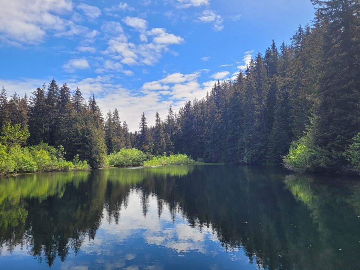 Am nächsten Tag nehmen wir uns den Rocky Ridge Trail vor. Das ist ein Rundweg, wir starten beim North Trail Head. Der Begriff „Ridge“ lässt schon vermuten, dass es bergauf geht. Ursprüngliche Natur, eine grüne Wildnis. Der schmale Pfad, dem wir folgen, ist gut erkennbar. Auch in diesem Wald gibt es zahlreiche Spuren von Bären. Ein Abstecher führt zu einem Stausee, in dem gerade ein Weißkopfseeadler badet. Wir entdecken Elch-Spuren im Matsch. Ganz deutlich sind die Abdrücke der gespaltenen Hufe zu erkennen. Eine weitere Abzweigung gibt es, nachdem wir etwa zwei Drittel der Strecke zurückgelegt haben. Nirgends beschrieben und nicht auf der Karte eingezeichnet. Beide Pfade sind gleich breit und sehen gut aus. Wir entscheiden uns für den Links-Abbieger, weil der nach oben führt und wir einen Ausblick auf die Seldovia Bay mit der Walkabout erwarten. Schon bald wird uns klar, dass dieser in die falsche Richtung führt, aber wir gehen dennoch eine Stunde auf diesem Weg weiter. Sind einfach neugierig, wo das wohl hinführt …. Macht keinen Sinn, wir entfernen uns immer weiter vom Ort, also umkehren und zurück.