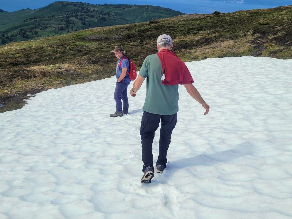 Nach 3 Stunden strammer Wanderung wechselt die Landschaft zu alpiner Vegetation. Hier wachsen nur noch Moose, Flechten und vereinzelte Krüppelbäume. Die zu querenden Schneefelder werden immer größer. Unsere Tour ist weiter als gedacht. Gegen 15.00 Uhr am Nachmittag haben wir den höchsten Punkt erreicht und laufen auf der Ridgeline mit Aussicht zu allen Seiten. 1102 Meter Höhe ab Strand-Niveau sind anstrengend für Segler. Einmal kurz ins Moos legen und ausstrecken ….. Wir möchten am liebsten gar nicht mehr aufstehen.