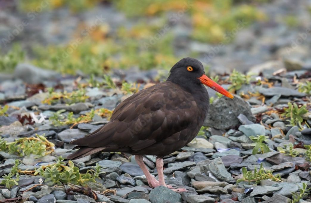 Entlang der Küste umwandern wir die Insel. Zum Teil geht es am Strand entlang, wo Alaska-Austernfischer spazierengehen. Der grell-rote Schnabel leuchtet auffällig wie bei unseren Austernfischern an der Nordsee, das Federkleid ist jedoch etwas anders gefärbt.