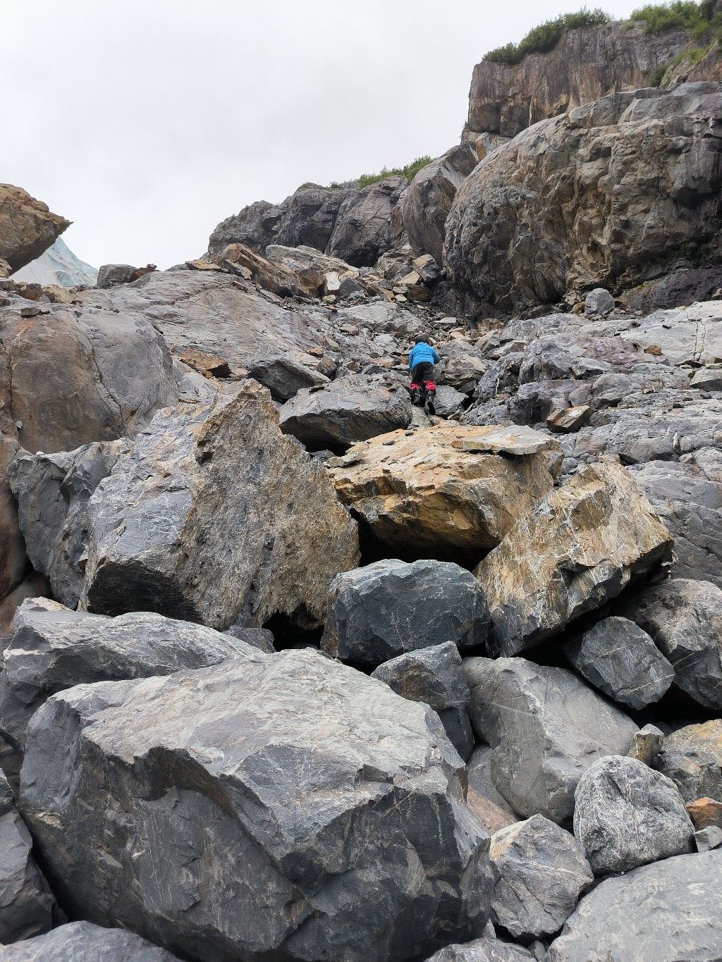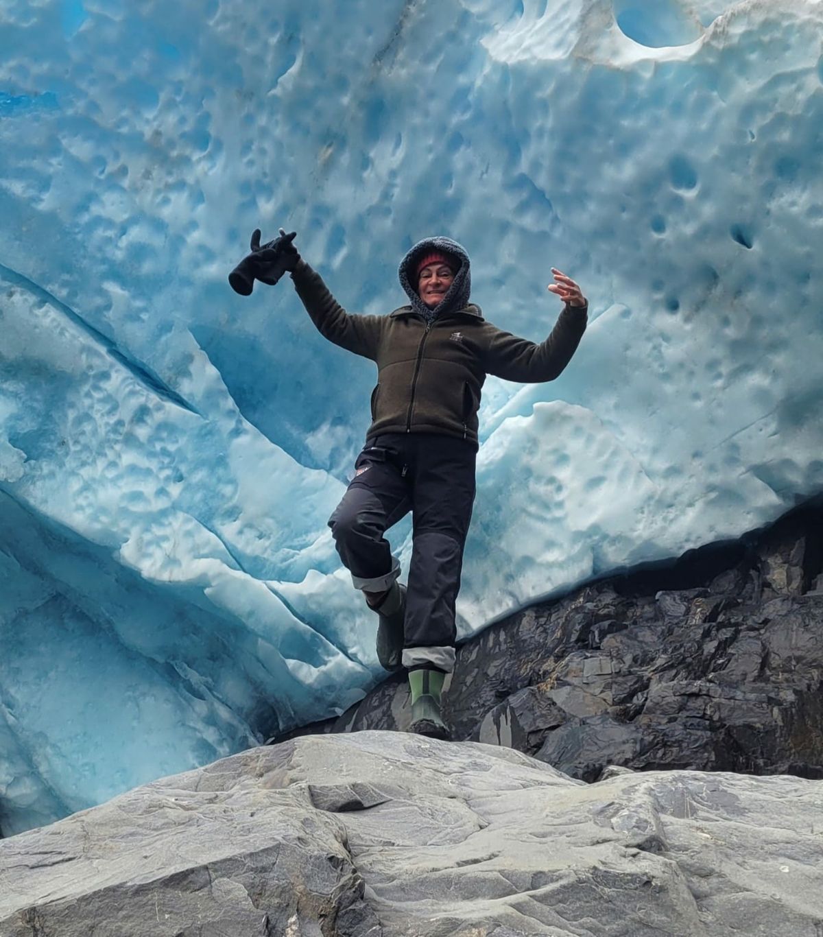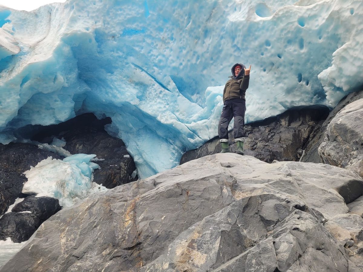 Thomas steigt über Geröll einen steilen Hang hinauf und kommt so nahe an die kalte Wand, dass er den Gletscher mit der Hand berühren kann. Dann schnell zurück, denn der Strand wird immer schmaler. Die Flut ist inzwischen so stark angestiegen, dass unser Dingi bereits im Wasser liegt und munter aufschwimmt. Der Käpt’n schafft es mit seinen hohen Gummistiefeln gerade noch rechtzeitig, das Beiboot vom Stein zu lösen und durch die Felsen zu manövrieren.