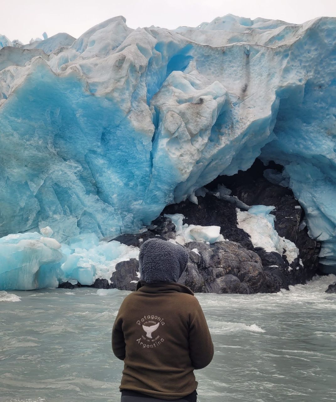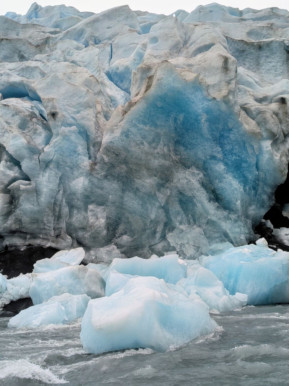 Der Fluss unter dem Eis ist stärker als es vom Boot ausgesehen hat. Der Gletscher muss an dieser Stelle komplett unterhöhlt sein. Darüber gibt es einen eisigen Überhang. Da sollte man sich besser nicht zu dicht heranwagen, aber das geht sowieso nicht.
