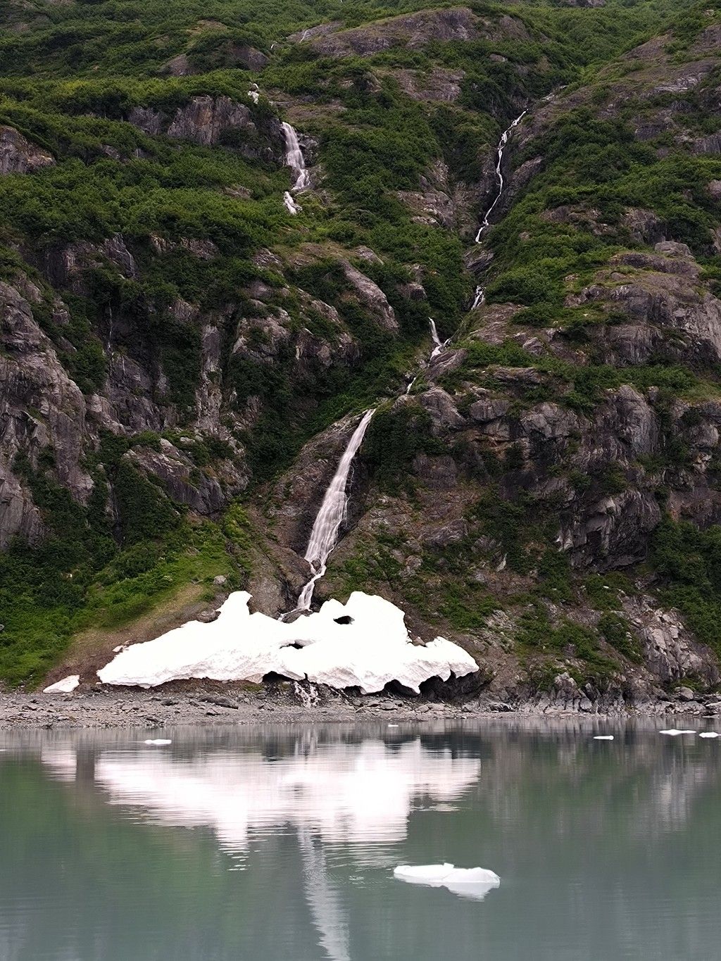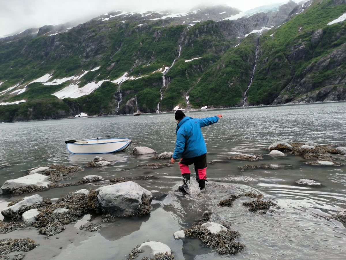 Der Tiger Gletscher ist 9,5 Kilometer lang und hat eine Breite von 2,5 Kilometern. Er endet am Kopf der Icy Bay. Wir sind früh am Ziel und treiben alleine vor der weißen Wand. Auf der rechten Seite ist ein kleines Stück Strand zu sehen. Aus einer Höhle im Eis sprudelt es, da kommt ein Wasserfall ans Tageslicht. Das Wetter ist so ruhig, dass wir einen Landgang wagen können. Gerade erst Niedrigwasser vorbei, das sollte doch passen.