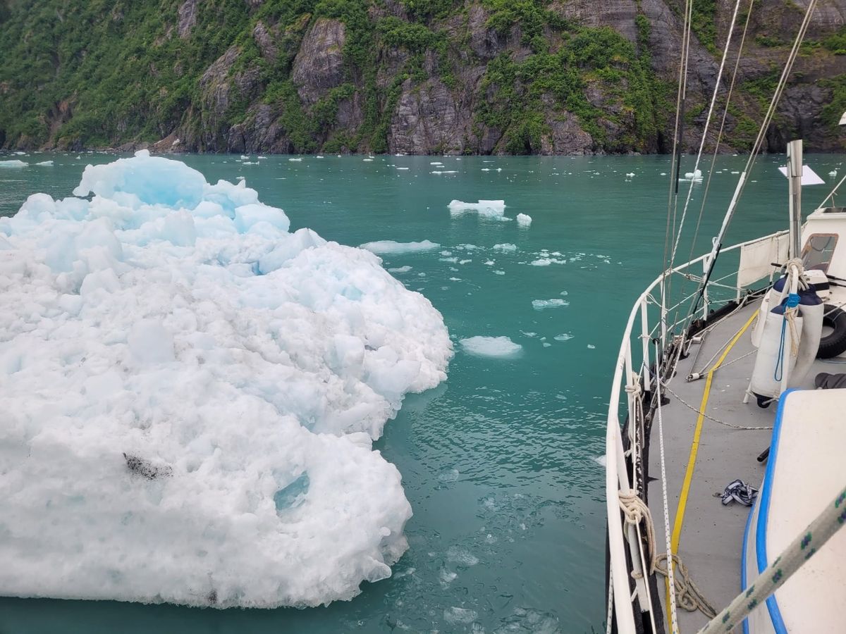 Für Freitag sind viel Wind und Regen vorhergesagt, deswegen stehen Donnerstag gleich zwei Gletscher auf dem Tagesprogramm. Der Tiger Glacier und der Chenega Glacier liegen fast um die Ecke. Keine weiten Wege heute, insgesamt nur etwa 20 Seemeilen. Eine Stunde vor Niedrigwasser geht es los. Das entgegenkommende Eis scheint aus dem rechten Arm zu treiben, das ist der Nassau Fjord, der am Chenega endet. Wir entscheiden uns zunächst für den linken Fjord, das ist der längere Weg.
