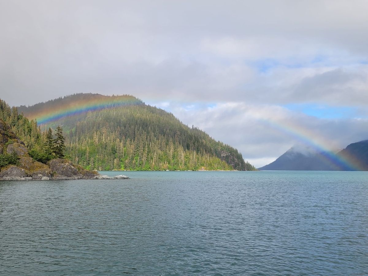 Schlechtes Wetter am Freitag, genau wie erwartet. Erst zum Abend hin klart es auf. Ein Regenbogen in kräftigen Farben spannt sich über die Icy Bay. Sehr malerisch. 🙂