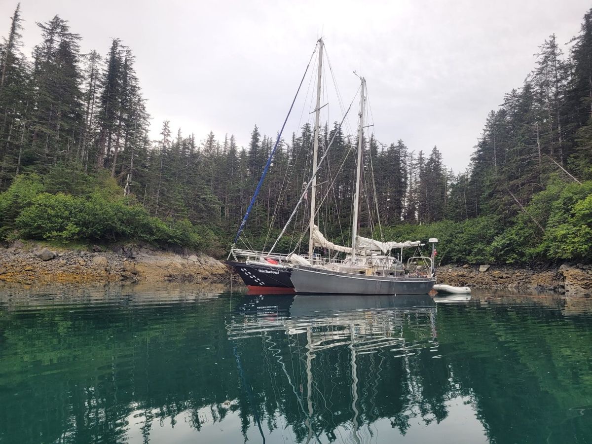 Auffällig viele Hunde gibt es im Dorf. Vielleicht sollen sie die Bären aus dem Vorgarten fernhalten. Unser Ankerplatz vor dem Hafen ist wunderbar ruhig. Früh ins Bett und 13,5 Stunden Schlaf. Morgens entdecken wir die „Picaway“ von Andy ganz in der Nähe. Er ist mit unserer alten Windsteueranlage beschäftigt, und Thomas paddelt hinüber, um zu helfen. Mit auflaufender Tide machen wir uns auf den weiten Weg in den Fjord, um eine etwas bessere Startposition für den Hubbard Gletscher zu bekommen. Ereignisloser Tag. Angeln ohne Erfolg. Feierabend um 19.00 Uhr am Ende eines schmalen Fjordes. „Chicago Harbor“ ist sehr eng und wild. Es ist wirklich nicht viel Platz hier. Die Picaway kommt bei uns längsseits, so dass beide Boote nur an einem Anker hängen. Unser Rocna mit Kette ist stark genug. Thomas bringt zur Sicherheit noch eine Heckleine an Land aus.
