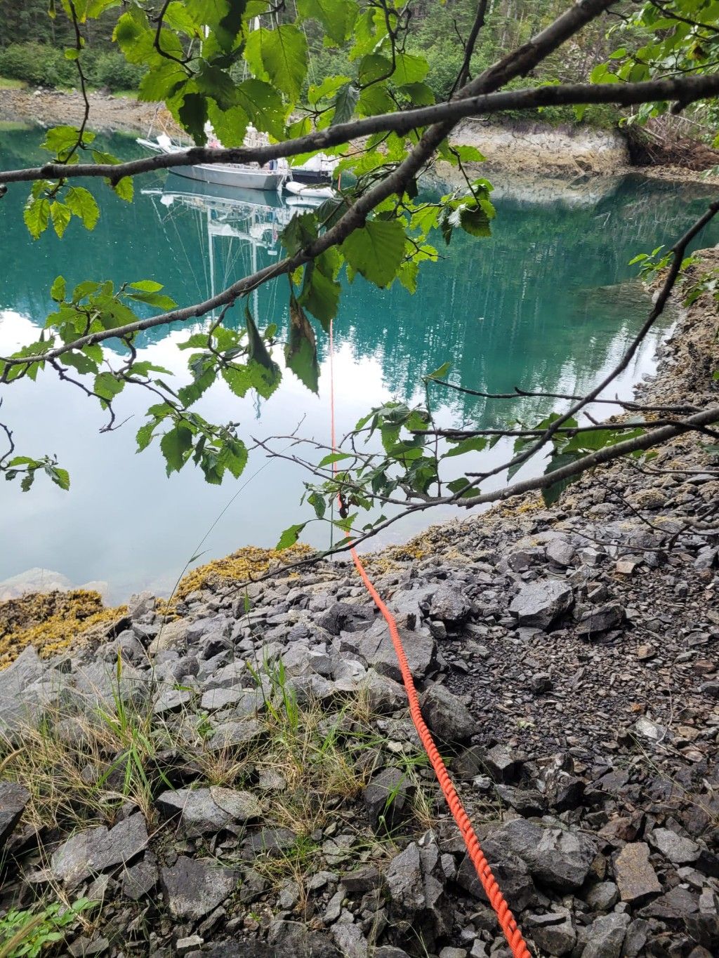 Laufen ist ganz schlecht auf diesem Küstenstreifen, das sah vom Boot aus besser aus. Hier gibt es nur Geröll, und bei halber Tide liegt alles voll mit schleimigem Grünzeug. Sehr rutschig in Gummistiefeln, deswegen kehren wir nach kurzer Zeit um. Der Käpt’n hat in weiser Voraussicht die Angel ins Dingi gelegt. Lange keinen Fisch mehr gegessen. 😉 Wir paddeln und treiben im Regen durch die Bucht. Thomas zeigt Erbarmen und bringt mich nach einer Stunde zurück zur Walkabout. Er selber hat noch nicht genug ( bisher 3 kleine Rockfische ). Nach einer weiteren Stunde kommt er mit reicher Beute nach Hause. Nass bis auf die Haut, aber sehr erfolgreich. Es wird leckeren Rockfisch und einen Lingcod zum Abendessen geben. Vorher noch Duschen im eiskalten Regen, das ist ein ganz besonderes Erlebnis.