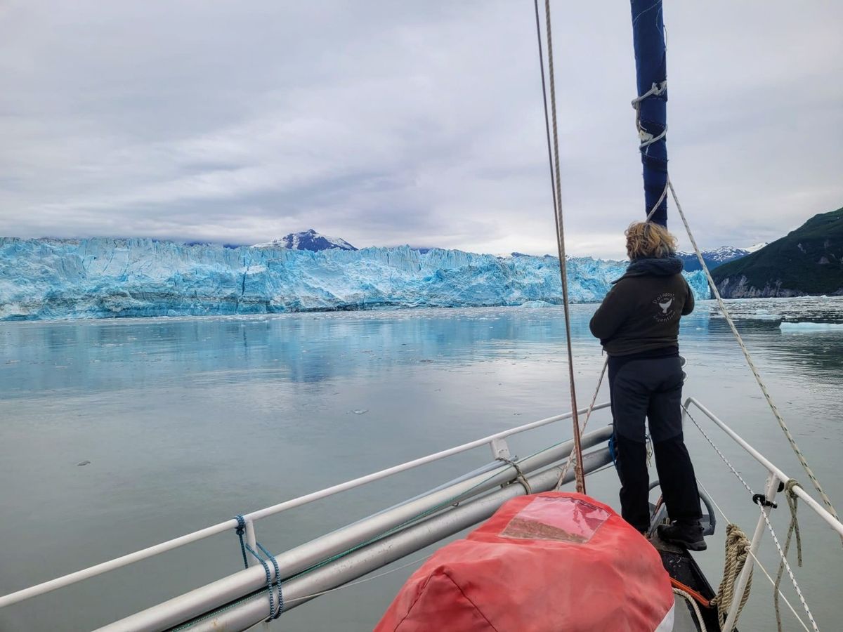 Start am Dienstag früh bei Hochwasser. Alles ruhig, nur ein bisschen Schwell in der Bucht. Leichter Gegenwind über 8 Seemeilen bis zur Ausfahrt der Yakutat Bay. Wir fahren scheinbar unter einem Regenbogen hindurch. Draußen dann Wellen von der Seite. Bäh ! Hohe Dünung, es schaukelt sofort unangenehm. Der Magen hebt und senkt sich. Das Frühstück können wir uns erstmal sparen. Kaffee schmeckt auch gerade nicht. Großsegel hoch und bloß weg aus dem flachen Küstenbereich. Besondere Vorsicht ist geboten, dass man nicht mit den zahlreichen toten Baumstämmen kollidiert. Treibholz überall, und das wird wohl auch noch eine Weile so bleiben. Die Einschnitte in diesem Teil der Küstenlinie tragen folgende Namen ( der Reihe nach ): Lost River, Black Sand, Dangerous River, Dry Bay. Deutsche Übersetzung : verlorener Fluss, schwarzer Sand, gefährlicher Fluss, trockene Bucht. Das hört sich alles nicht so entspannt an, da halten wir lieber einen großen Abstand zur Küste.