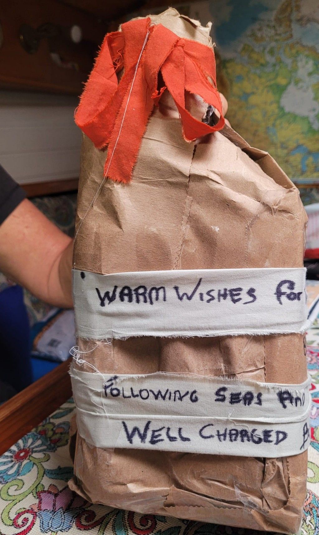 Am nächsten Morgen verlassen alle Fischer den Hafen. Das Unwetter ist vorbei. Auch Andy und Stuart fahren los. Beim Abschied bekommen wir ein geheimnisvolles Geschenk überreicht. Auspacken macht Spaß. Es kommen Orangensaft und Kartoffeln zum Vorschein. Habe ich denen etwa erzählt, dass wir diese Sachen wegen der exorbitanten Preise beim letzten Einkauf nicht mitgenommen haben ? Demnach sind die Männer wohl sehr gute Zuhörer ! 🙂
