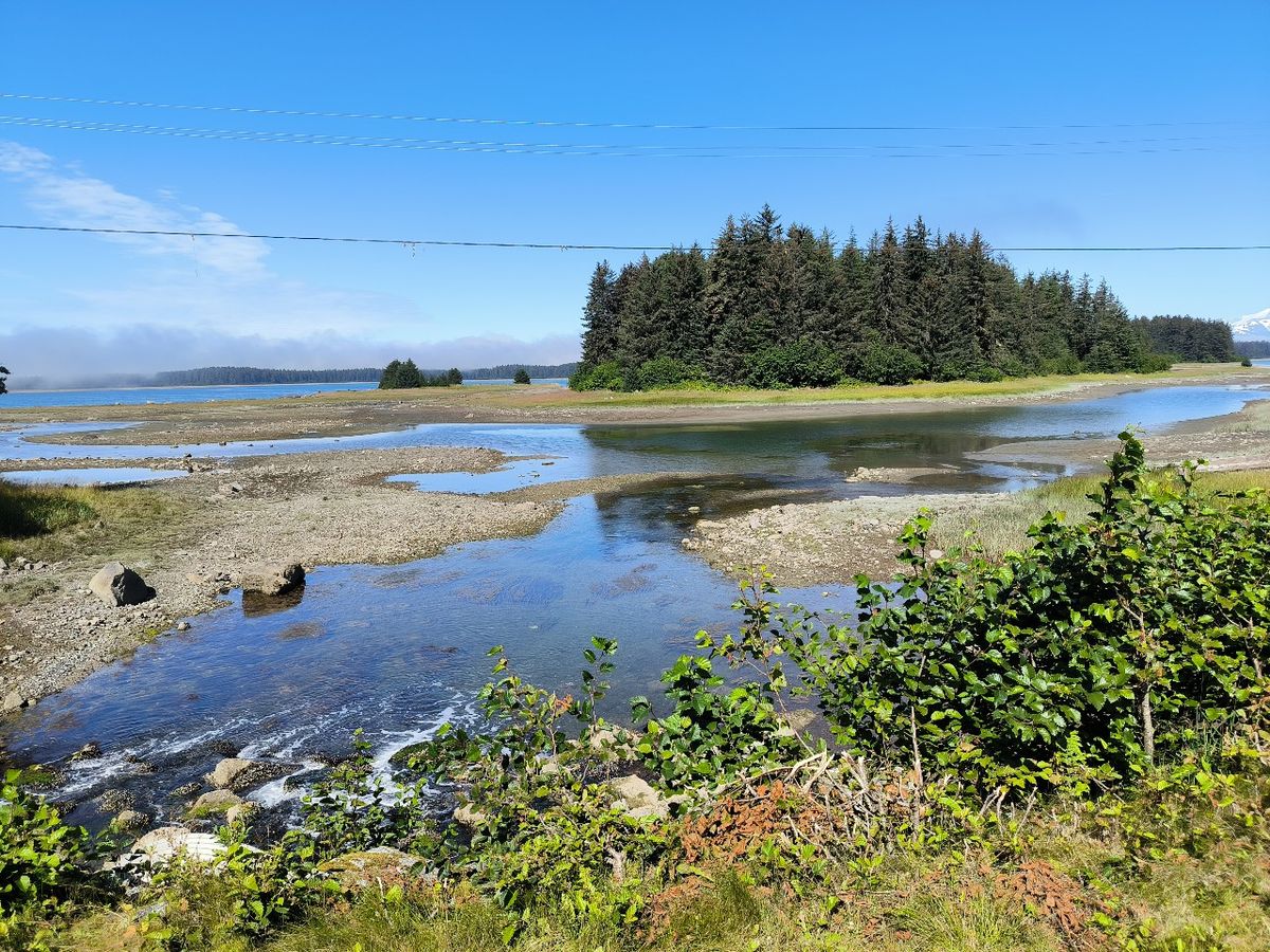 Am frühen Nachmittag erreichen wir den bekannten Ankerplatz vor dem kleinen Hafen. Thomas klappert die wenigen Läden im Dorf ab auf der Suche nach einer einfachen Batterie. Theoretisch könnte er eine kaufen, aber der Preis ist so unverschämt teuer, dass er darauf verzichtet. Irgendetwas wird er sich ausdenken, dann wird eben gebastelt. Angelgeschäfte oder Läden für Auto- und Bootszubehör interessieren mich nicht besonders. Ich mache einen Ausflug zur Lagune, wo wir letztens ein Schild „Barney’s Trail“ gesehen haben. Ein Wanderweg im Grünen um einen Teich ist genau das Richtige ( dachte ich ). Aber mein Abenteuer dauert nicht lange. Der Wind bewegt die Äste der Bäume, Eichhörnchen rascheln im Laub, merkwürdige Vogelstimmen, Wasser plätschert überall, viele verschiedene Geräusche …. wie das eben so ist an einer Lagune. Mir wird mulmig, nachdem ich über drei Bärenhaufen auf dem Weg gestapft bin. Bär-Spray schussbereit in der Hand, trotzdem ist es unheimlich alleine. Auf gar keinen Fall möchte ich mich auf eine der Bänke setzen und Pause machen. Ich fange an zu schwitzen, und mir wird schlecht. Abbruch, Rückzug. Entlang der Straße fühle ich mich wohler, obwohl wir auch dort einige kapitale Haufen gesehen haben. Nachts nutzen die Bären gerne die Straße, so wie die Einheimischen uns erzählen.