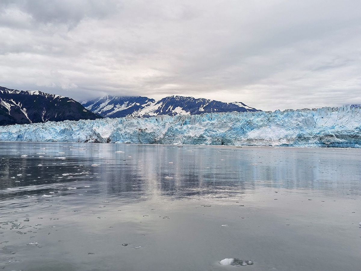 Das Wetter ist durchwachsen. Der Tag ist und bleibt grau, die Sonne fehlt. Aber wir sind zufrieden, ab Mittag war eigentlich Regen angesagt. Das Eis um uns herum knistert. Die Luft ist prickelnd frisch. Die Eisberge scheinen zu atmen. Sie heben und senken sich oder drehen sich im Wasser und machen dabei unheimliche Geräusche. Viele Stunden fahren wir auf die Front des Gletschers zu, und er scheint überhaupt nicht näher zu kommen. Dafür haben wir den Hubbard Glacier ganz für uns alleine. Lassen uns dort treiben, lauschen dem Donnern und starren gebannt auf die hellblau-weiße Wand voraus. Von seiner Quelle im Yukon-Territorium ( Kanada ) erstreckt sich der Gletscher über 122 Kilometer in die Disenchantment Bay und in die Yakutat Bay. Er ist damit der längste in einem Gewässer endende Gletscher Alaskas. Seine Stirnseite misst über zehn Kilometer. Wirklich imposant !