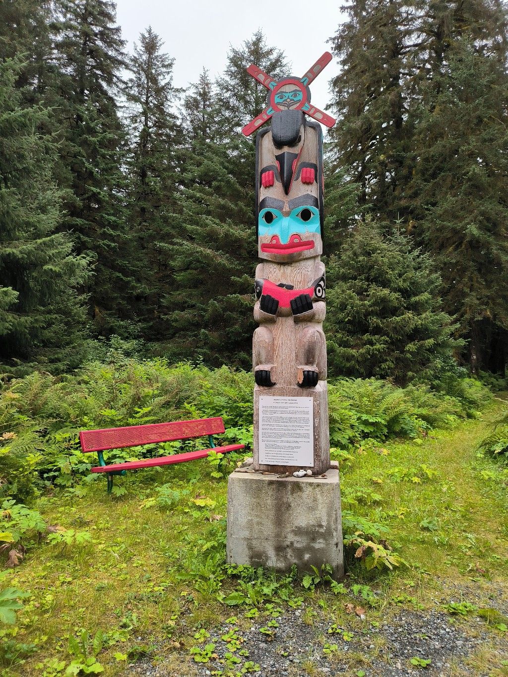 Ich entdecke einen Wanderweg, auf dem es mich nicht gruselt. Der „Lagoon Trail“ ist ein breiter Pfad mit hölzernen Brücken über die sumpfigen Passagen. Er führt zu einem Totempfahl, den wir schon aus der Ferne von der anderen Seite der Lagune gesehen hatten. Weiter wage ich mich nicht alleine, denn ich habe keine Ahnung, wo dieser Weg enden wird.