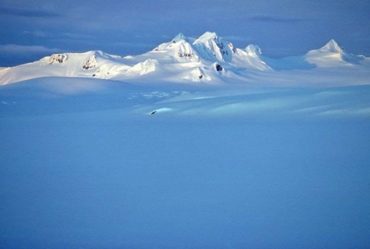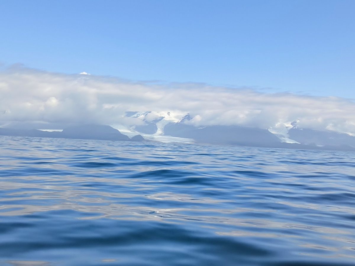 Backbord liegt der Glacier Bay Nationalpark und die beeindruckende Küstenlinie der Fairweather Range. Der Mount Fairweather mit einer Höhe von 4671 Metern dominiert die Landschaft. Die meiste Zeit des Tages ist die Bergkette von tiefhängenden Wolken eingehüllt. Nur die besonders hohen Gipfel stoßen mit ihrer weißen Spitze durch die Wolkendecke. Wir haben Glück, dass sich der Vorhang für eine halbe Stunde lüftet. Vom Brady Eisfeld aus ziehen sich Gletscher die Berge hinunter. Der La Perouse Glacier leuchtet zur Linken und scheint trotz unseres Sicherheitsabstands von 6 Seemeilen ganz nahe zu sein. Er ist der einzige Gletscher, der an dieser Küste noch in den Pazifischen Ozean kalbt. Die Gletscherzunge am Meer weist eine Breite von über 3 Kilometern auf, an der Stirnseite erreicht er eine Höhe von 130 Metern. Etwas weiter südlich ist ein weiterer markanter Gipfel der Fairweather Range zu sehen. Mount La Perouse ist 3270 Meter hoch und steht auf der Grenze von Alaska zu Kanada.