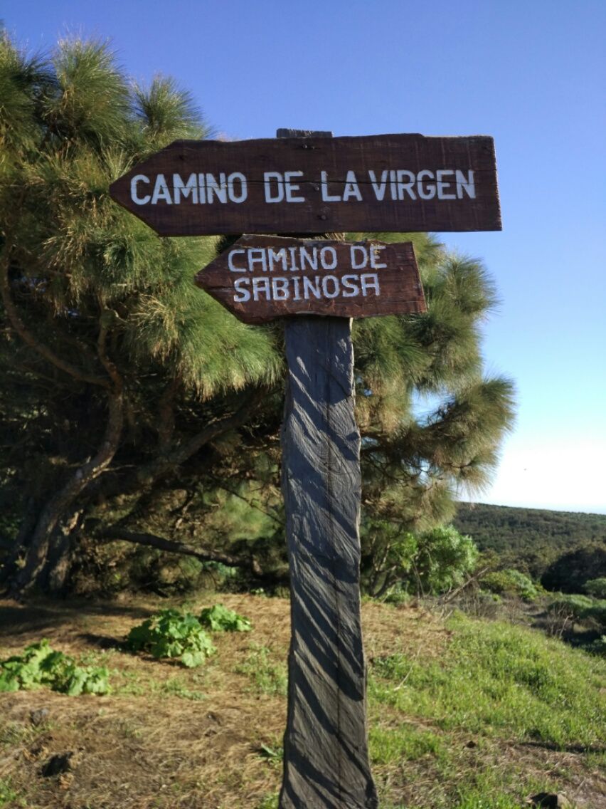 Ich steige am Mirador der Jinama oberhalb von Frontera ein auf den Camino de la Virgen. Dieser „Jungfrauenweg“ ist ein Teilstück des GR131 und durchläuft auf einer Länge von 27 Kilometern die Insel in der Mitte. In amerikanische Maß-Einheit umgewandelt sind das etwas mehr als 17 Meilen – kein Ding. Allerdings habe ich Mühe, dem Trail zu folgen, denn der Camino de la Virgen ist nur sehr sparsam markiert. So schnell wie ich den Weg gefunden habe, so schnell ist die Spur auch schon wieder verschwunden. Irgendwann ist es mir egal. Ich habe keine Lust mehr, so viel Zeit mit Suchen zu verbringen. Es ist doch überall schön hier zwischen alten Kanarischen Kiefern und Wacholder. Inzwischen befinde ich mich auf der Sonnenseite der Insel. Zum Glück kann ich so meine ungefähre Richtung nach dem Stand der Sonne bestimmen. Ich laufe mal nach Süden und mal nach Westen, je nachdem, wo mich eine einladende Piste in den Wald hineinführt. Im Süd-Westen muss die Kirche liegen, an der ich morgen früh frisches Trinkwasser auffüllen möchte. Nach ungefähr der Hälfte des Camino de la Virgen habe ich es geschafft und komme an ein eindeutiges Zeichen. Das Cruz de los Reyes liegt etwa in der Mitte der Strecke, ab hier bleibe ich auf dem GR131.