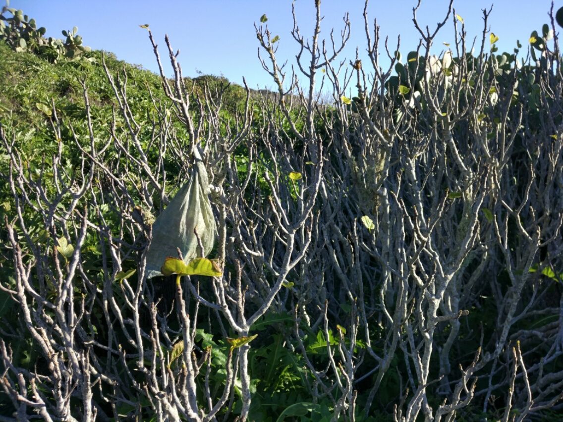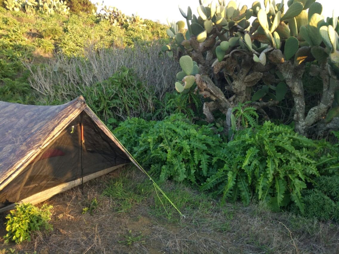 Ein paar Eidechsen leisten mir Gesellschaft, sie flitzen auf dem Tisch hin und her. Über mir am Himmel ist ein Falke auf Beute aus. Ich habe Zeit zum Baden, Lesen, Schreiben. Mehr als 4 Stunden bleibe ich alleine an der Mole Orchilla. Dann nähern sich kurz hintereinander zwei Wagen und halten auf dem Parkplatz. Aufbruch-Stimmung bei mir, denn schließlich muss ich noch 10 Kilometer wieder aufsteigen. Ich erreiche bereits um 18.00 Uhr meinen Zeltplatz. Natürlich hängt der Proviant noch unschuldig im Busch. Dort gibt es ein opulentes Abendessen mit Brot, Butter, Salami, Ölsardinen, Joghurt und Müsli. Die Butter ist geschmolzen, der Joghurt ist warm, aber es schmeckt ausgezeichnet. 🙂