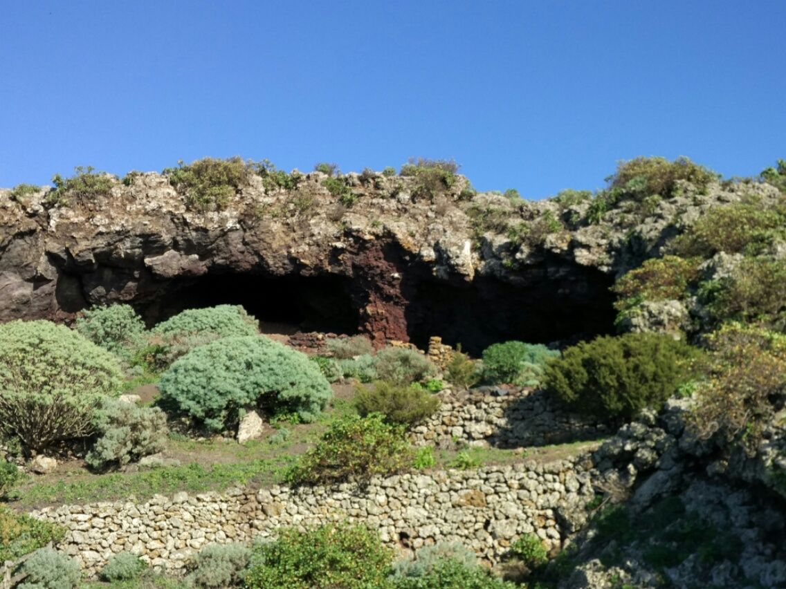 Jeden Morgen bin ich schon zwischen 5.00 Uhr und 5.30 Uhr früh wach. Mein Schlaf-Rhythmus ist völlig durcheinander, mein Wärme-Haushalt auch. In meinem Zimmer ist es kühl, ich sitze mit Daunenjacke und Wolldecke um die Beine gewickelt. Da kann man doch viel besser den Tag nutzen und etwas unternehmen. Ich habe mir vorgenommen, mit dem Bus nach La Restinga zu fahren, dort ein paar Stunden im Dorf zu verbringen und danach die 10 Kilometer zum Strand Cala de Tacorón zu wandern. Soweit der Plan, aber als ich am Bus-Terminal ankomme, da muss ich feststellen, dass ich mich leider gründlich geirrt habe. Der Bus, den ich um 9.30 Uhr nehmen wollte, fährt ab Valverde und nicht ab Frontera. Das würde bedeuten, ich muss zuerst zurück nach Valverde fahren, mit einem anderen Bus bis nach El Pinar, dann dort noch einmal umsteigen und bis La Restinga. Heute ist Sonntag, der sowieso sparsame Fahrplan noch einmal mehr ausgedünnt. Ich studiere an der Tafel mit den Linien und Abfahrtszeiten meine Optionen, finde aber nichts Gescheites. Ich hatte mich auf eine längere Tour eingestellt, im Rucksack habe ich Zelt, Isomatte, Schlafsack, Stöcker, Ninas Lampe und Proviant für 3 Tage. Aufgeben und zurück zur Pension kommt nicht in Frage. Ich überlege mir einen Alternativ-Plan und beginne in Frontera den Camino de Jinama mit einem 6 Kilometer langen knackigen Aufstieg. Dabei wird eine imposante Steilwand durchquert, vorbei an Schluchten, Höhlen und Naturstein-Mauern.