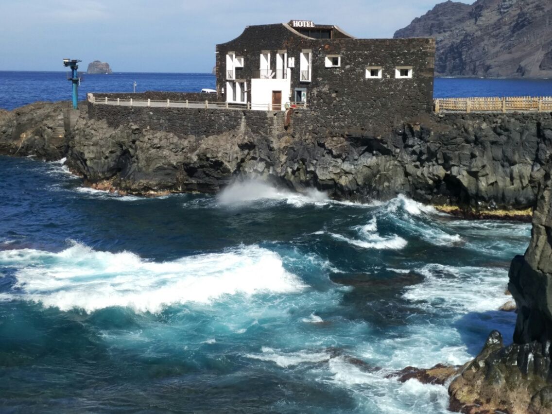 Mein nächstes Ziel ist Las Puntas, das nur 8 Kilometer von Frontera entfernt liegt. Das besondere an dieser Ortschaft ist das kleinste Hotel der Welt. Es steht auf einer Landzunge direkt auf den Klippen und ist mit seinen vier Zimmern sogar im Guiness Buch der Rekorde verzeichnet. Auf dem Weg dorthin komme ich am Ecomuseo de Guinea und Lagartario vorbei. Einen Besuch im Freilicht-Museum und in der Echsen-Aufzuchtstation spare ich mir, denn Beides kenne ich bereits. Trotzdem zieht es mich in das kleine Häuschen, in dem Kasse, Information und Souvenir-Laden untergebracht sind. Finde ein schönes Andenken zum Mitnehmen und freue mich darüber, dass ich es nicht lange im Tages-Gepäck tragen muss. In Las Puntas entdecke ich einen neuen Wanderweg nach La Maceta. Er führt auf Bretterstegen durch schwarze Lava-Landschaft direkt an der Küste entlang. Oben auf den Klippen gibt es in regelmäßigen Abständen überdachte Picknick-Plätze mit Blick auf die Atlantik-Brandung. Einer davon ist der „Mirador Playa del Rio“ – ausgesprochen schön angelegt.