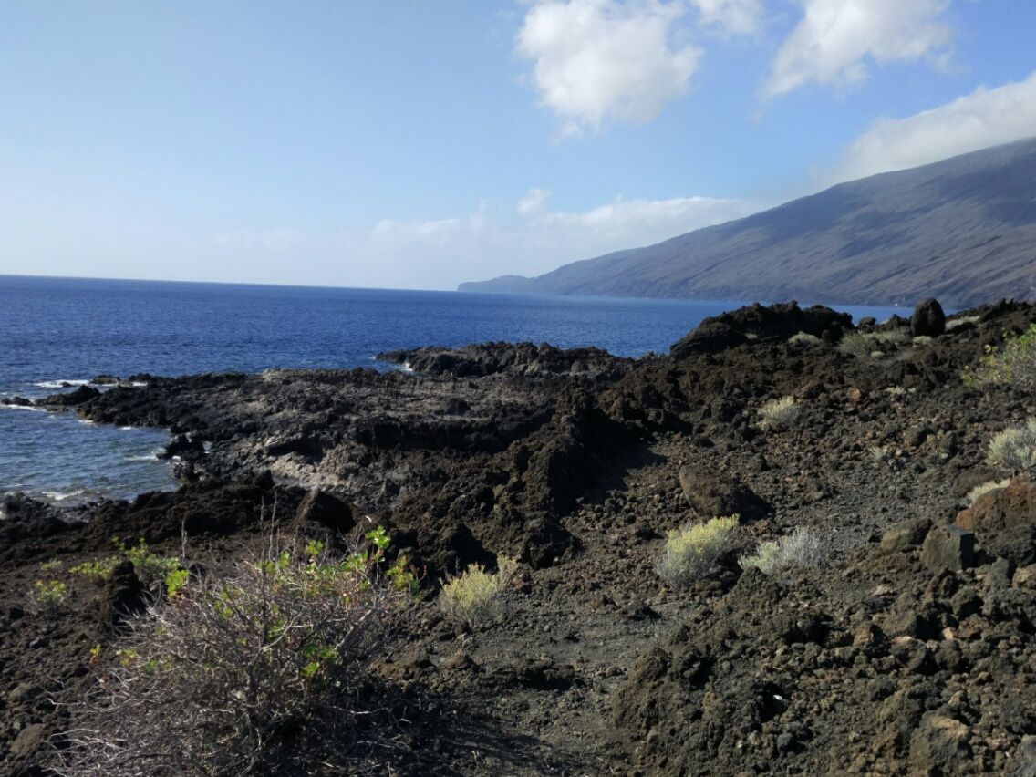 La Restinga ist schnell abgegrast. Da die Restaurants offensichtlich nicht zur Mittagszeit öffnen, kann ich mich schon nach wenigen Stunden auf den Weg nach Tacorón machen. Zunächst 6 Kilometer auf einer wenig befahrenen Straße, bergauf und mit starkem Gegenwind – das gibt keinen neuen Geschwindigkeitsrekord. Ich muss aufpassen, dass die Böen mich nicht in den Straßengraben drücken. Nehme die Stöcker zu Hilfe, damit kommt man gleich viel energischer vorwärts. Ich bin froh, als ich über den letzten Hügel bin, denn von da aus geht es nur noch 5 Kilometer abwärts und im Windschatten. Die letzten beiden Serpentinen kann ich mir sparen, ein steiler Pfad durch Geröll führt direkt nach unten. Schon von Weitem sehe ich : keine Tische und Stühle draußen. Es ist Wochenende, schönes Wetter, aber die kleine Snack-Bar hat geschlossen. Dann wird es dort wohl auch morgen nichts zu Beißen geben. Wie gut, dass ich vorgesorgt habe. Auf dem Parkplatz stehen ungefähr 15 Autos. So viel los, das hatte ich nicht erwartet. Aber die Cala de Tacorón gilt als der sonnensicherste Platz auf El Hierro, das wissen nicht nur die Touristen zu schätzen. Mir persönlich ist es entschieden zu voll. Außerdem ist Samstag, da werden eventuell die Einheimischen über Nacht bleiben und Party veranstalten. Und an den Grill-Plätzen gibt es sowieso viel zu viele Kakerlaken. Ich bin gar nicht scharf auf die künstlich angelegten Fels-Terrassen zum Sonnenbaden, sondern biege bereits ein Stück vor dem Weg in die Klippen ab. Es gibt keinen Pfad, aber über die festen Lava-Brocken lässt es sich gut laufen. Eine weit vom Trubel entfernte Bucht lädt zum Bleiben ein. Hier kommt bestimmt Niemand hin …. höchstens das Wasser. Ich werde die Tide in den nächsten Stunden gut beobachten müssen. Von wegen …. Kaum habe ich mich eingerichtet, war eine Runde schwimmen und entspanne mich auf der Luftmatratze, da kommt ein nackter Mann über die Felsen geklettert. So einsam kann wohl kein Ort der Welt sein, dass nicht doch noch ein Mensch um die Ecke erscheint. Ruckzuck bin ich in meine Klamotten geschlüpft, die für so einen Fall immer griffbereit liegen. Der Mann hebt grüßend die Hand und geht tauchen. Wir stören uns einfach nicht aneinander, und irgendwann verschwindet er auch wieder mit einem freundlichen „Adios“. Südwestlich von La Restinga bis hin zum Leuchtturm von Orchilla, befindet sich das 750 Hektar große Meeres-Schutzgebiet Mar de las Calmas. Ein Paradies für Taucher, aber auch sehr gut überwacht und reglementiert. Bin wieder alleine und genieße die milde Luft. Es ist schon fast zu heiß, denn die Sonne hat die schwarzen Lava-Felsen ordentlich aufgeheizt. Aufstellen des Zeltes funktioniert natürlich nicht zwischen den Klippen, aber es verspricht eine ruhige und trockene Nacht zu werden. Luftmatratze, Schlafsack und warme Kleidung, mit der ich ja am frühen Morgen von Frontera losgegangen bin, werden bestimmt ausreichen.