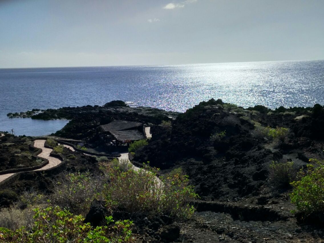 Ein Hinweis auf einem Holz-Schild beschreibt einen Weg zum Charco de los Sargos. Da war ich auch noch nie, das hört sich nach einem netten Spaziergang an. Eine schmutzige Schotterstraße führt in kürzester Zeit zum Ziel. Am Charco de los Sargos ist nichts los. Ein Kiosk, der natürlich geschlossen hat. Auf dem Parkplatz steht ein einziger Wagen. Der gehört zu einem Paar mit Kleinkind, die es sich weiter unten gemütlich gemacht haben. Nachdem ich die unzähligen Stufen hinab geklettert bin, entdecke ich eine sehr schöne Stelle ganz nahe an der Brandung. Viel besser als alle bisherigen Plätze, denn die Fläche ist eben, die Felsen sind rund und glatt, einfach perfekt zum Sitzen. Hier kann man es eine Weile aushalten, zumal jetzt gerade die Sonne von einem strahlend blauen Himmel scheint. 🙂