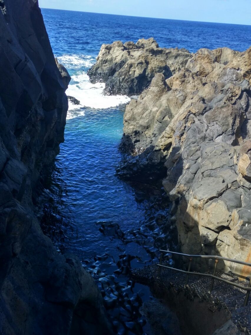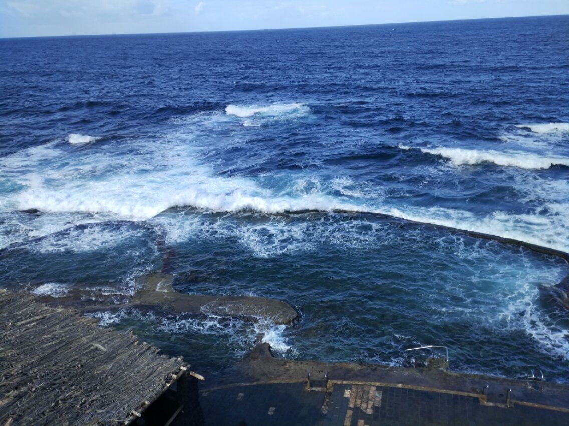 Das Wetter sieht nicht einladend aus. Trotzdem möchte ich gerne etwas unternehmen. Vor einigen Tagen habe ich in der Nähe des Ecomuseo de Guinea einen Wegweiser zum Natur-Strand nach La Maceta gesehen, den möchte ich gerne ausprobieren. Einige Kilometer bergab, dann zweigt ein Wanderweg ab Richtung Küste. Es geht zwischen winzigen Häuschen hindurch, sehr idyllisch. Man bekommt den Eindruck, dass man den Einheimischen beinahe durch’s Wohnzimmer läuft. Hühner, Hunde und Katzen begleiten mich. Unterwegs werde ich von einem heftigen Regenschauer überrascht, aber ich finde Schutz unter einer Reihe von hohen Palmen. Nach ein paar Minuten ist der Spuk schon wieder vorbei. Es ist gerade Hochwasser in La Maceta. Das bedeutet, die Natur-Schwimmbecken und die Fels-Terrassen werden von den Wellen überspült.